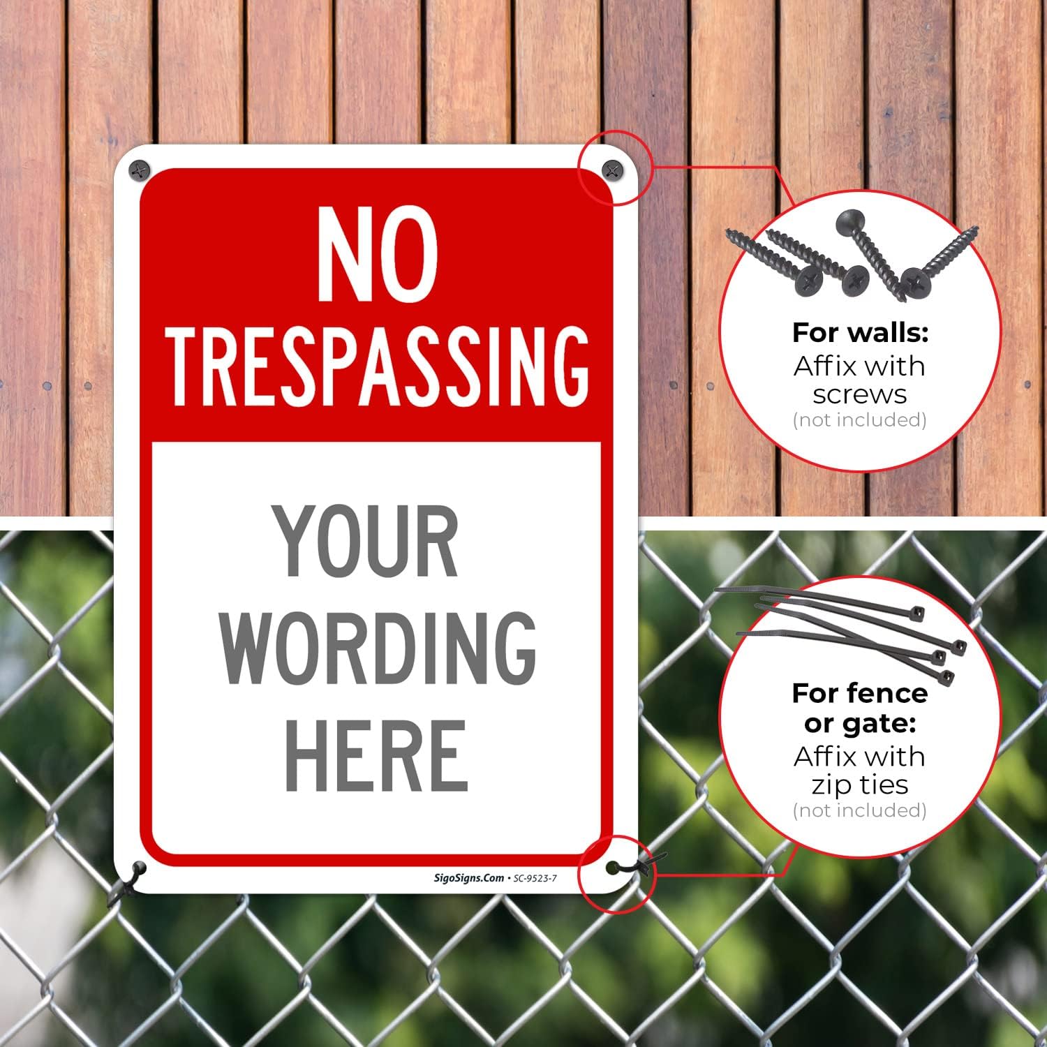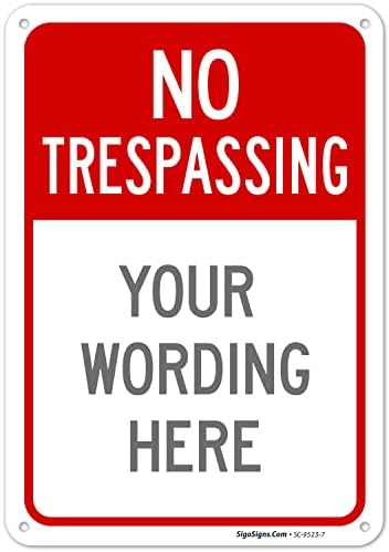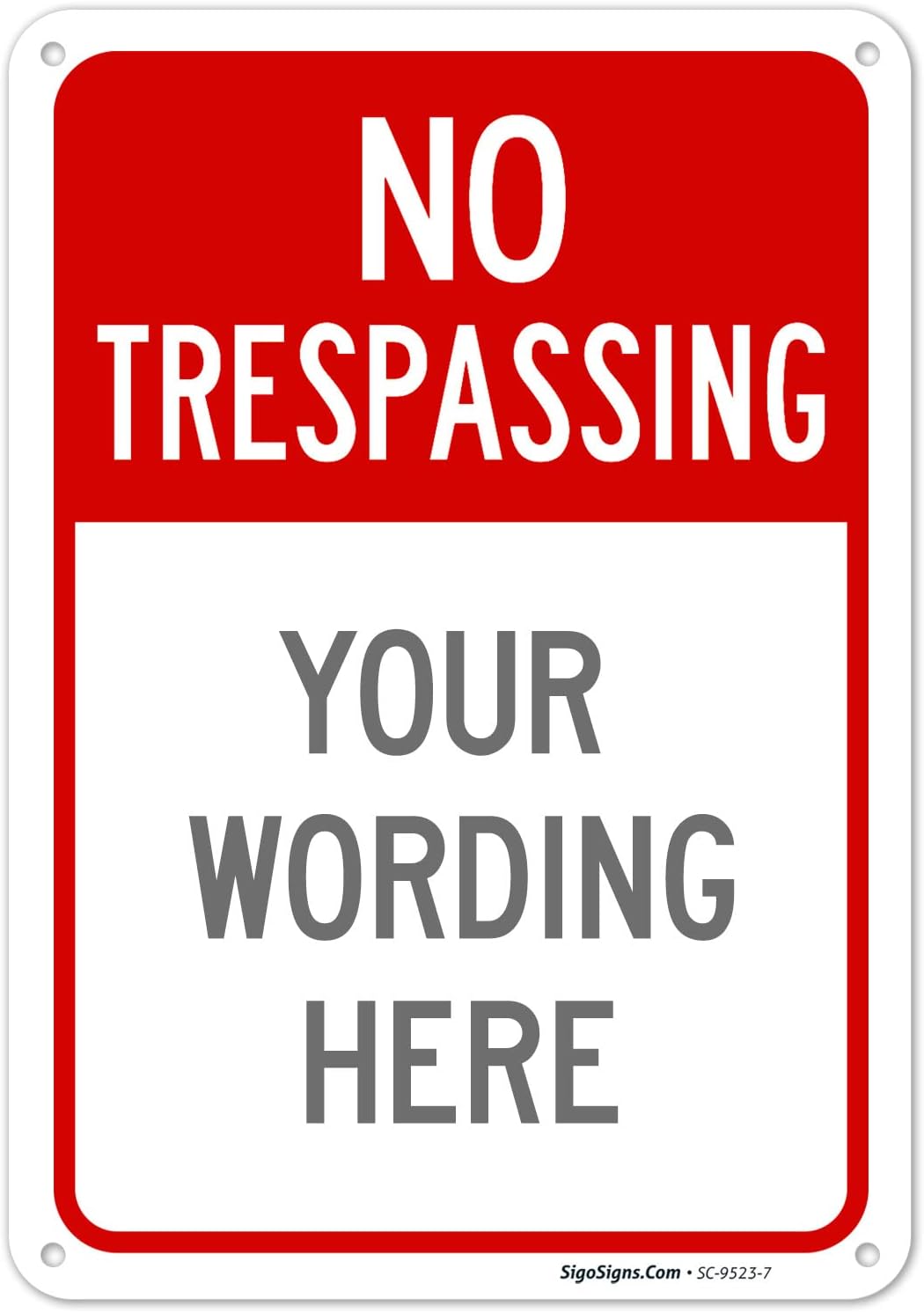 Sigo Signs - Custom No Trespassing Sign, Personalize for Business, School, Parking Lot, Driveway, for Outdoor/Indoor Use Sign, 10x7 Inches, Rust Free .040 Aluminum, Fade Resistant, Made in USA by Sigo Signs