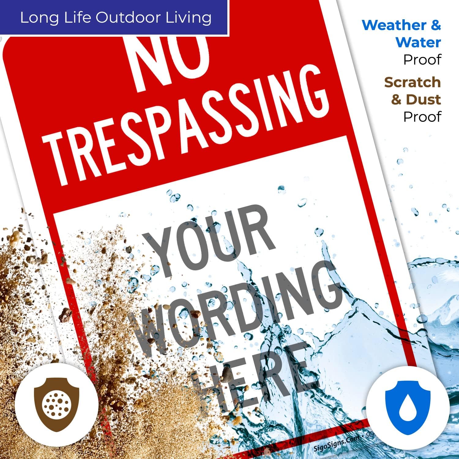 Sigo Signs Custom No Trespassing Sign, Personalize for Business, School, Parking Lot, Driveway, for Outdoor/Indoor Use Sign, 10x7 Inches, Rust Free .040 Aluminum, Fade Resistant, Made in USA