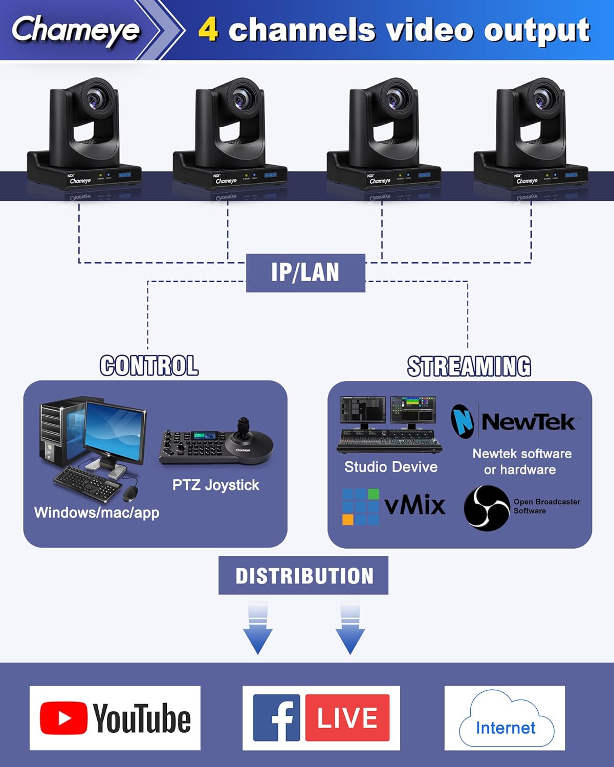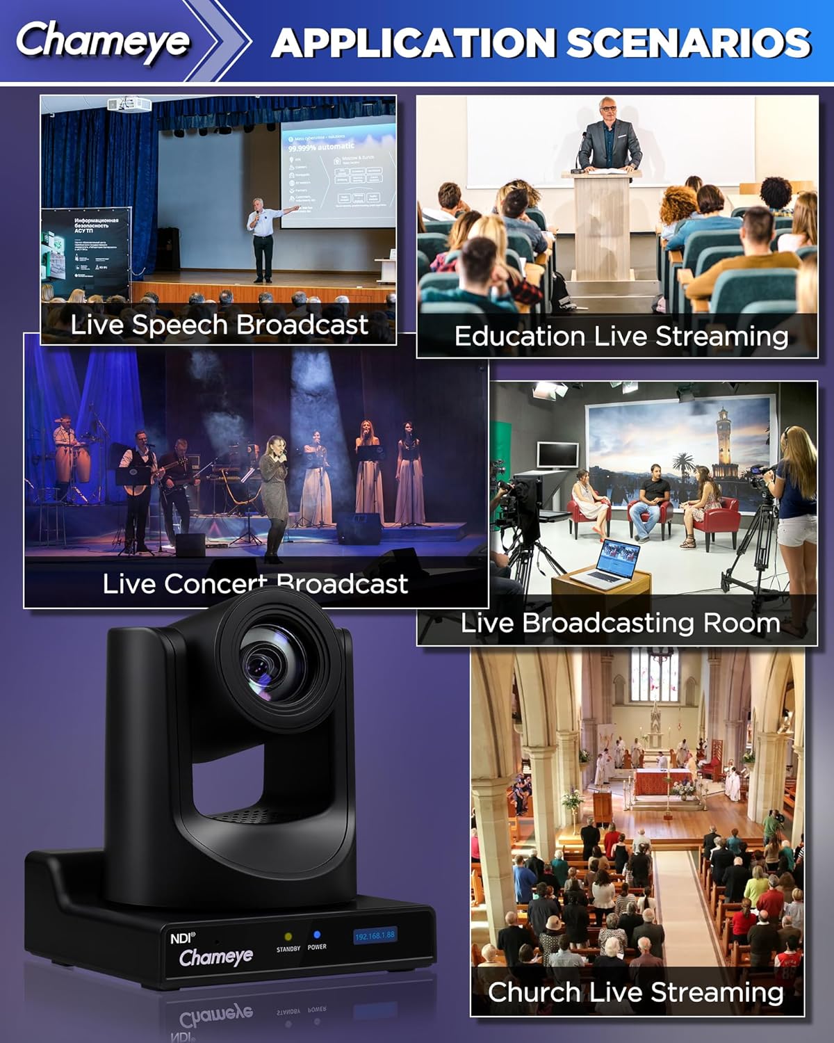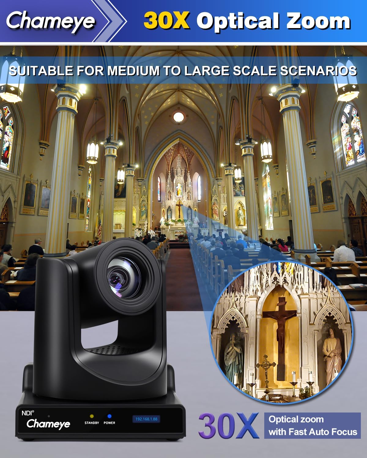 【Chameye NDI PTZ Camera】NDI Camera with 30x Optical Zoom. 3G-SDI HDMI Live Streaming Camera with 1/2.8-inch CMOS sensor, 2.07MP effective pixel, up to 1920x1080 resolution. It is true to life colors with pretty sharp and crystal clear video quality, up to 1080p 60fps. 30X NDI Camera for Church Live Streaming, houses of worship, video conferences, Education, eSport and live broadcast.
