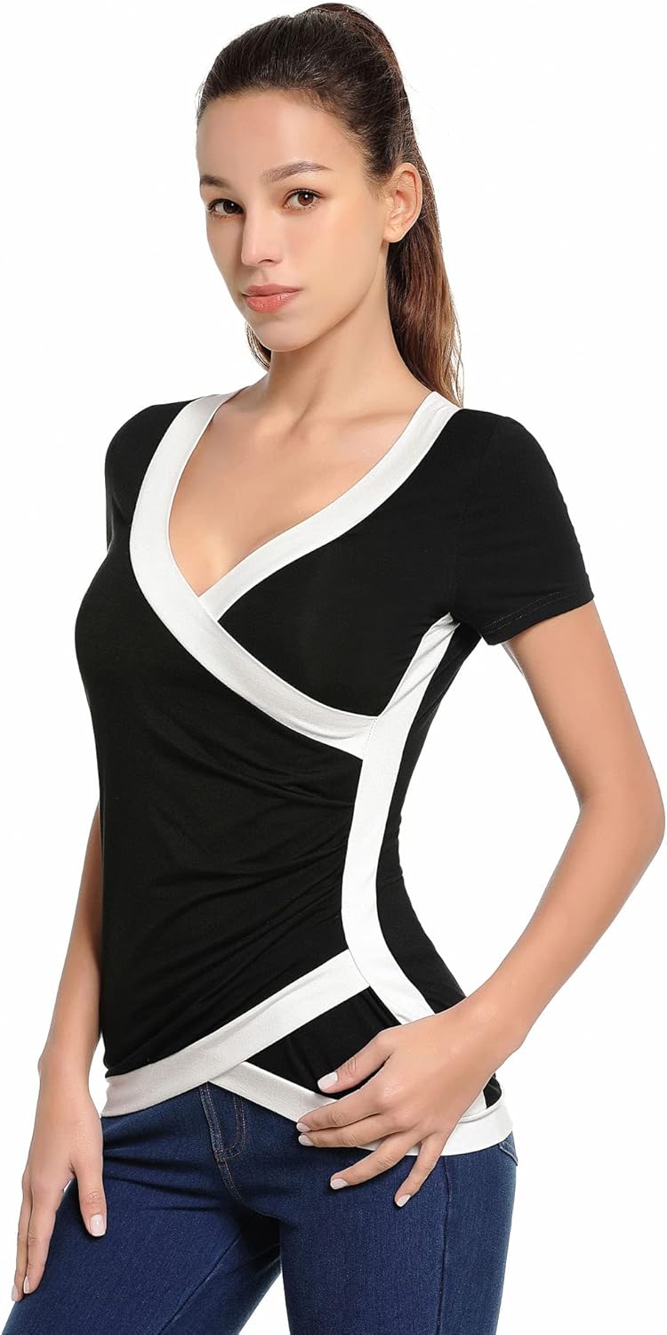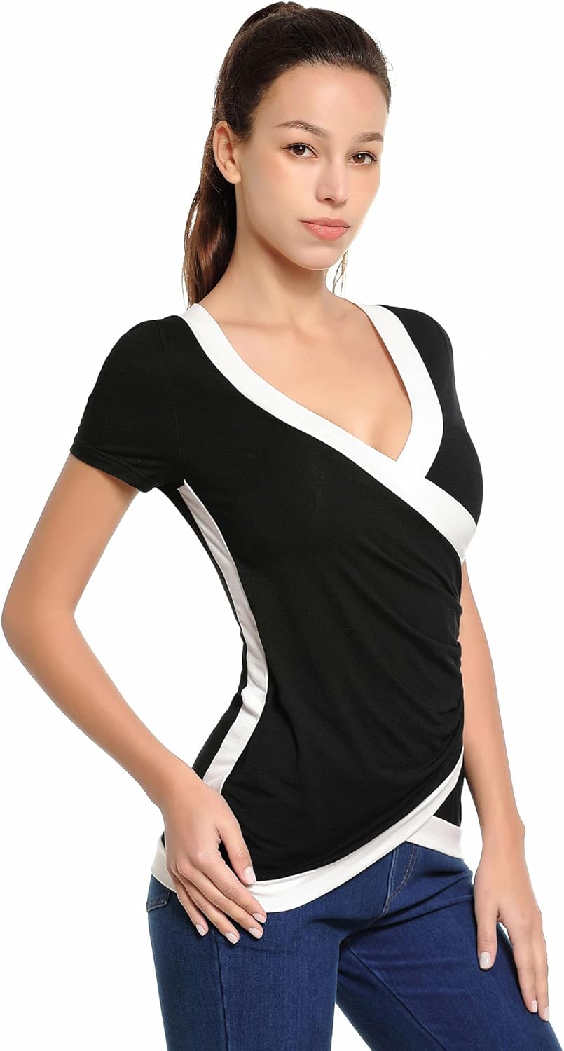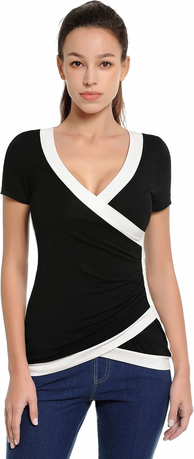 AmélieBoutik Women Color Trim V Neck Faux Wrap Pleated Detail Blouse