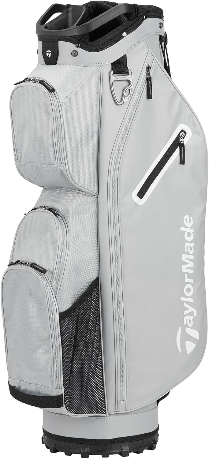 The TaylorMade Classic Cart golf bag has 15 individual full bag length club dividers, additional front-facing pockets for easier access and more storage, a new fade-resistent yarn dyed fabric that holds color longer with UV-protected materials, a built-in putter protecting polymer patch, a magnetic stash pocket, an oversized cooler pocket, and a split-side apparel pocket for more separation.