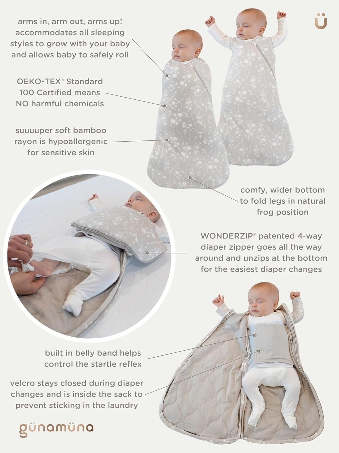 GUNAMUNA Swaddle Wrap for Newborns – Arms In or Out, Easy Diaper Changes with WONDERZiP, Soft Sleep Sack, 2.5 TOG