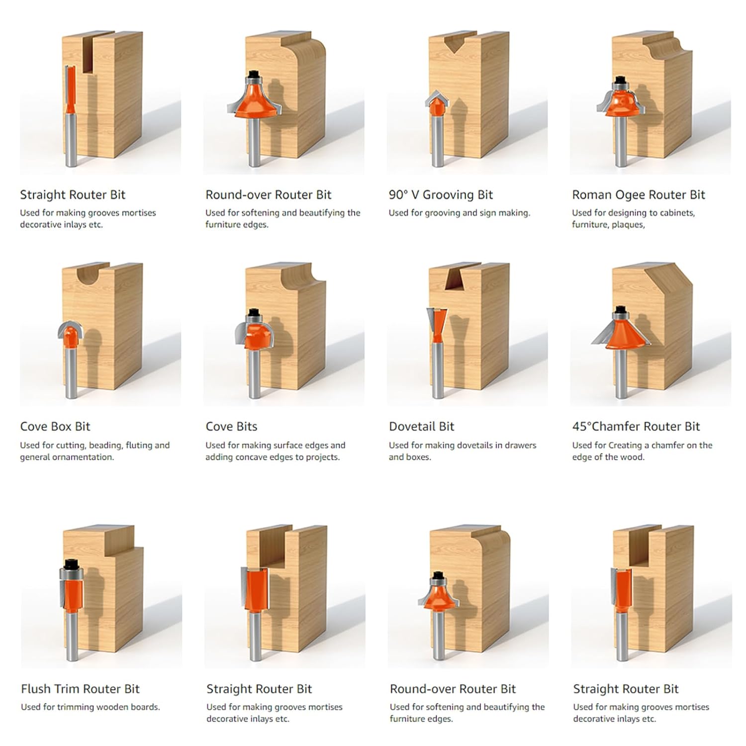 [Quality materials] Achieve clean and accurate cuts on all types of wood with our router bits, thanks to precisely machined C3 tungsten carbide blades that offer excellent resistance to heat.Our router bits are built to last, with hardened solid alloy steel construction and a powder coating finish that ensures durability and longevity.