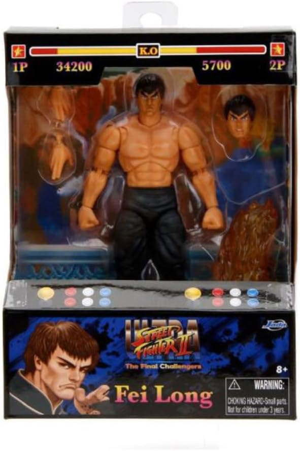 Prepárate para el enfrentamiento definitivo con estas figuras de acción Street Fighter II a escala 1:12 de Jada Toys. Estas figuras coleccionables presentan a tus personajes favoritos del clásico juego de video, incluyendo al maestro de artes marciales y estrella de cine Fei Long. La figura de Fei Long de 6” viene con manos alternas, cabeza y un accesorio de fuego de patada, y se presenta en empaquetado estilo arcade con detalles inspirados en el juego. Con su poderoso golpe de KO, Fei Long seguramente derrotará a cualquier oponente.