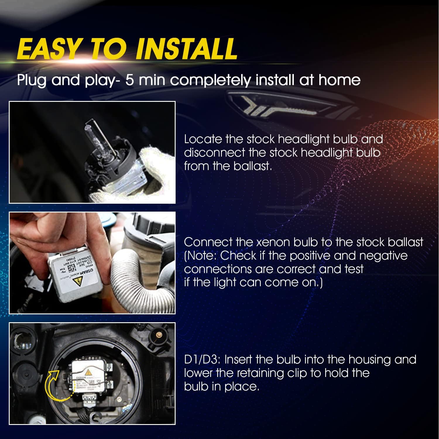 [Plug N Play] -- TECTICO D3S Xenon replacement bulbs are designed for your factory bulb housing, 1:1 size specification perfectly fits your high and low beam bulb plug, and you don't need to do any circuit modification, installation is very simple and convenient. Please avoid touching the bulb with your fingers when installing it.