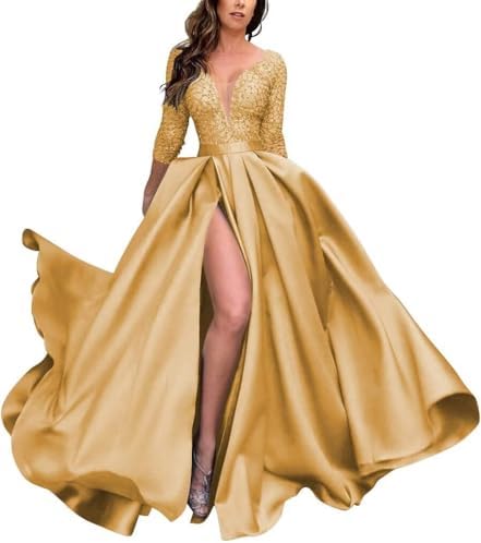 Vestidos de Fiesta con Bolsillo Cortado y Escote en V de Encaje, Vestido de Gala Largo de Manga 3/4