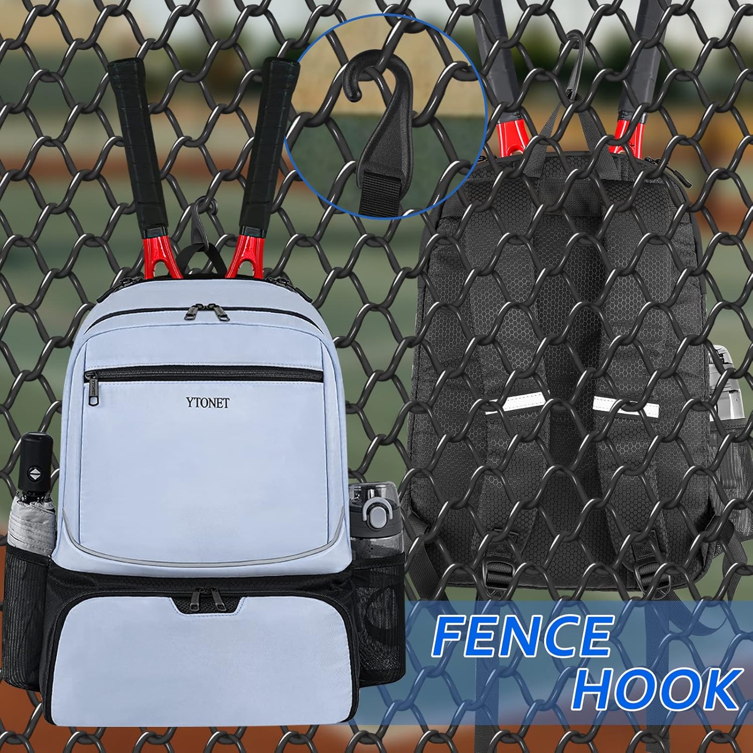 User-Friendly Designs: This tennis racket bag is designed with a padded racket-shaped compartment to separately hold and protect rackets well. And the double anti-slip zippers can help secure tennis rackets to stay in place. This tennis bag tennis backpack has a practical fence hook to freely hang on the net and reflective belts on shoulder straps can fix your sunglass or hat