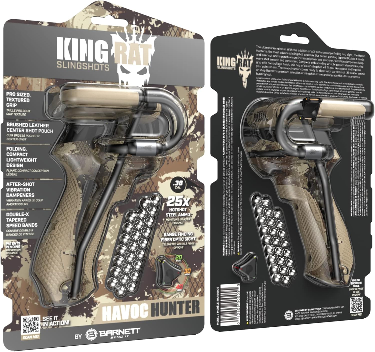 BARNETT HAVOC HUNTER SLINGSHOT: The Havoc Hunter is the most advanced slingshot available. This is the ideal slingshot for adults looking to elevate their precision & accuracy. Featuring advanced technology, each shot is sure to be powerful & precise The Black Widow Hunter Slingshot expands on the timeless Black Widow Design but with a premium diamond-cut knurled grip with a camouflage finish. Features Double-X tapered speed bands and .38 caliber ammo POWERFUL: Featuring Barnett's patent-pending tapered Double-X bands, and 3-distance range-finding ring sight, and laser-cut ammo pouch, this hunting slingshot ensures power and precision SMOOTH: Havoc features vibration dampeners to keep every shot smooth and consistent; while the folding wrist brace and diamond-knurled grip keep you on target SPECS: The Havoc Hunter slingshot system includes a slingshot with a diamond-knurled grip, brushed leather center shot pouch, Double-X bands, and 3-distance range-finding ring sight, .38 caliber ammo, in camo BARNETT: The most trusted name in crossbows since 1962