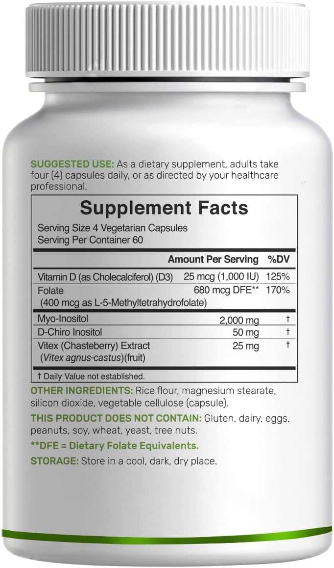 Suministro y Porciones – 240 cápsulas vegetarianas por botella, tamaño de porción de 4 cápsulas veg, 2,000mg de Mio-Inositol, 50mg de D-Quiro Inositol, 680mcg DFE de Folato, 1,000iu de Vitamina D3 y 25mg de Extracto de Baya de Vitex por porción, dura hasta 60 días.