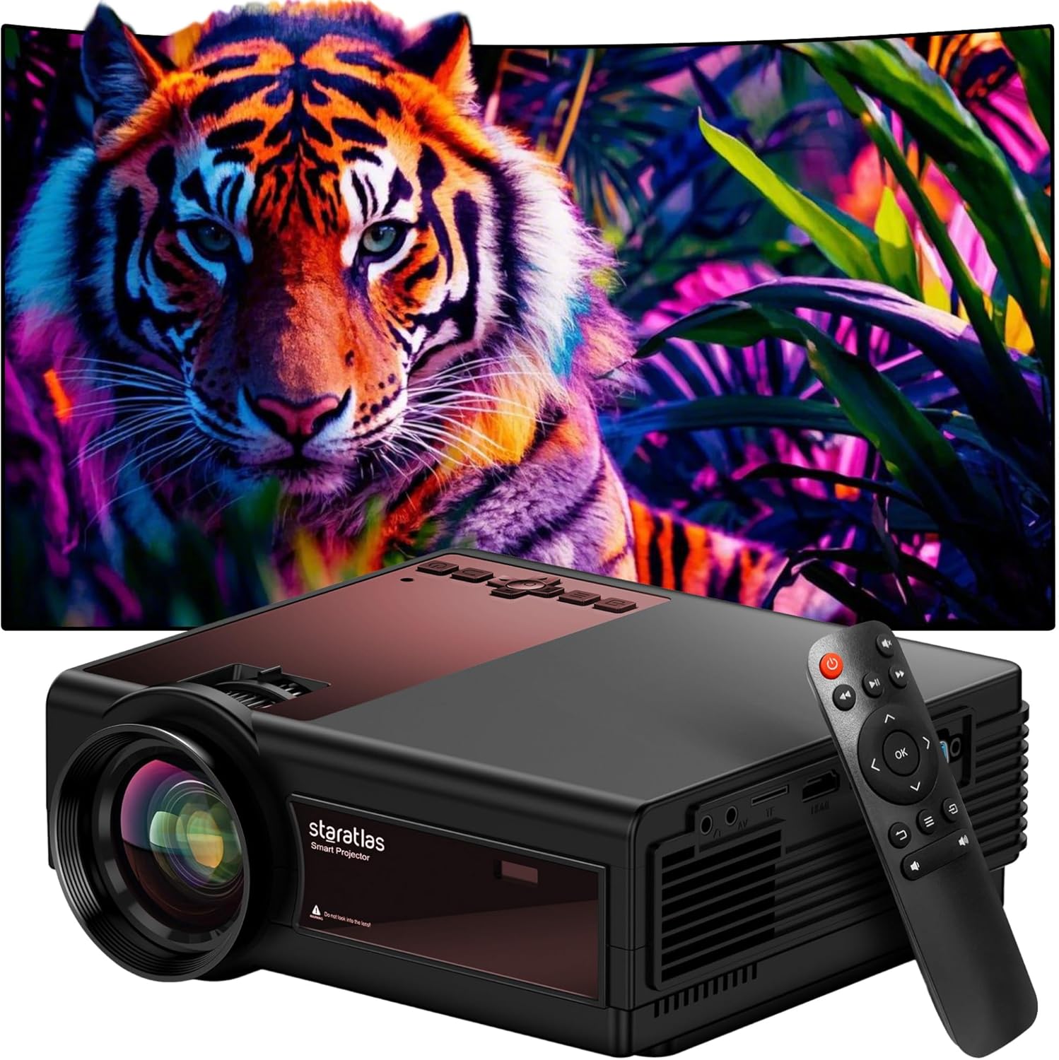【Proyector de Video Full HD Nativo 1080P】El proyector Staratlas proporciona una resolución nativa real de 1920*1080 con soporte 4K Full HD. Al usar la nueva tecnología de reproducción de color LCD 16770K, es posible proyectar con precisión todos los detalles en la pantalla. El mini proyector Staratlas ofrece un festín visual HD 1080P vívido e inmersivo para cada audiencia. Este es un proyector con wifi y bluetooth, un proyector de pared