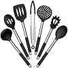 E-far Silicone Cooking Utensils Set, 7 Pcs Heat Resistant Kitchen Utensils with Stainless Steel Handle, Slotted Turner, Spoon, Soup Ladle, Pasta Server, Skimmer, Tongs for Nonstick Cookware, Black