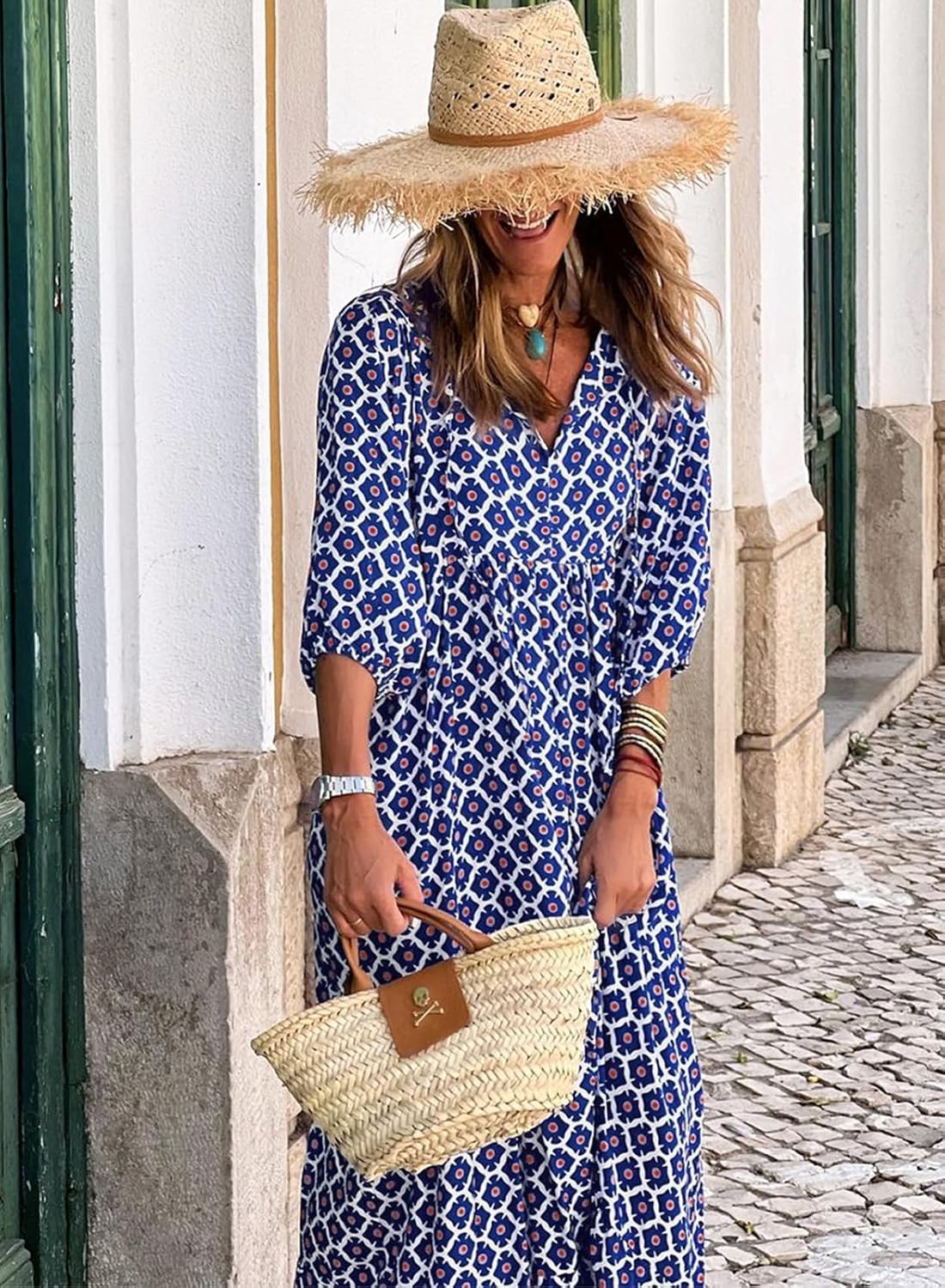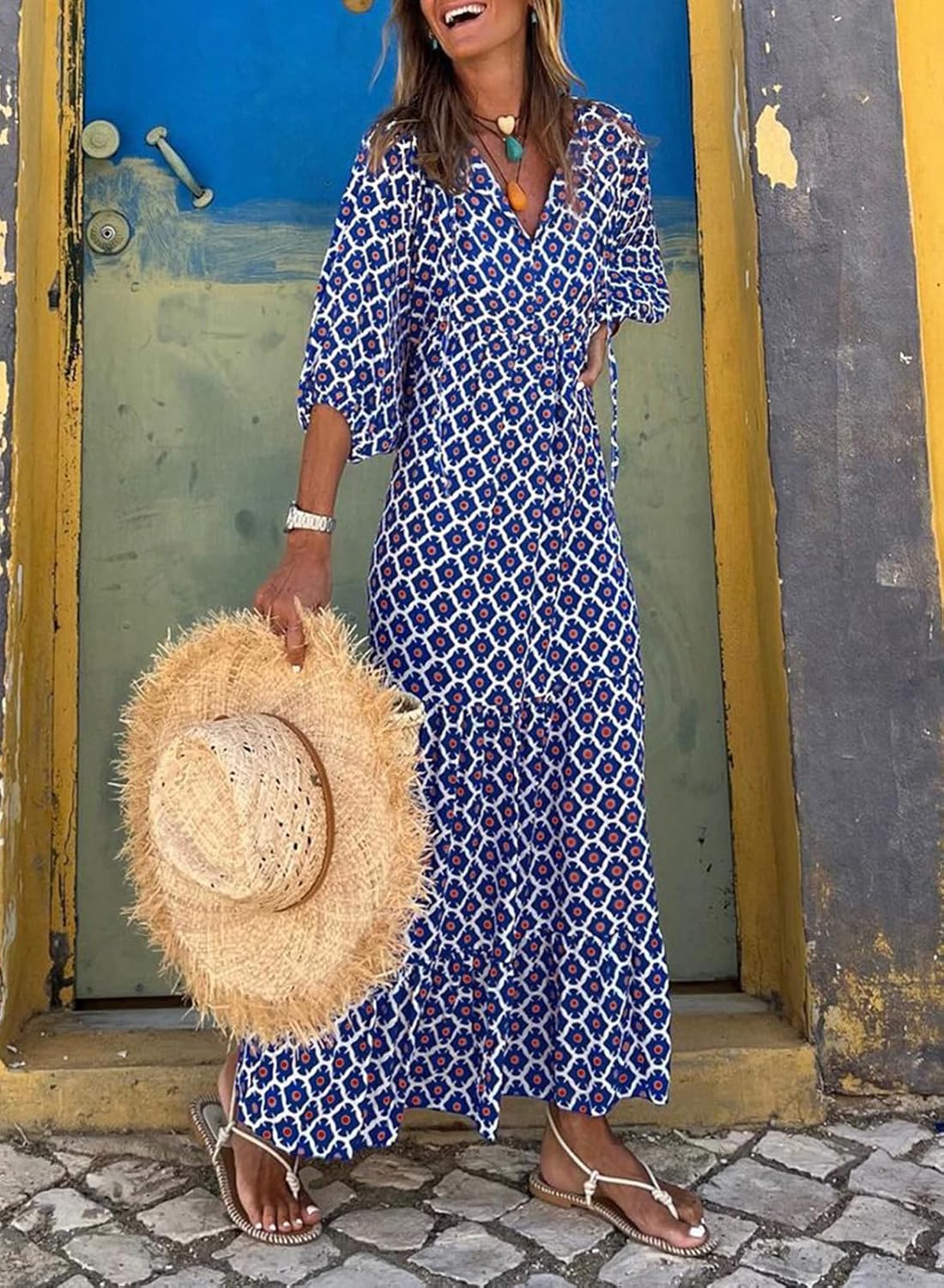miduo Womens Loose Fit Casual Summer V Neck Half Sleeve Bohemian Geometric Pattern Maxi Long Dresses