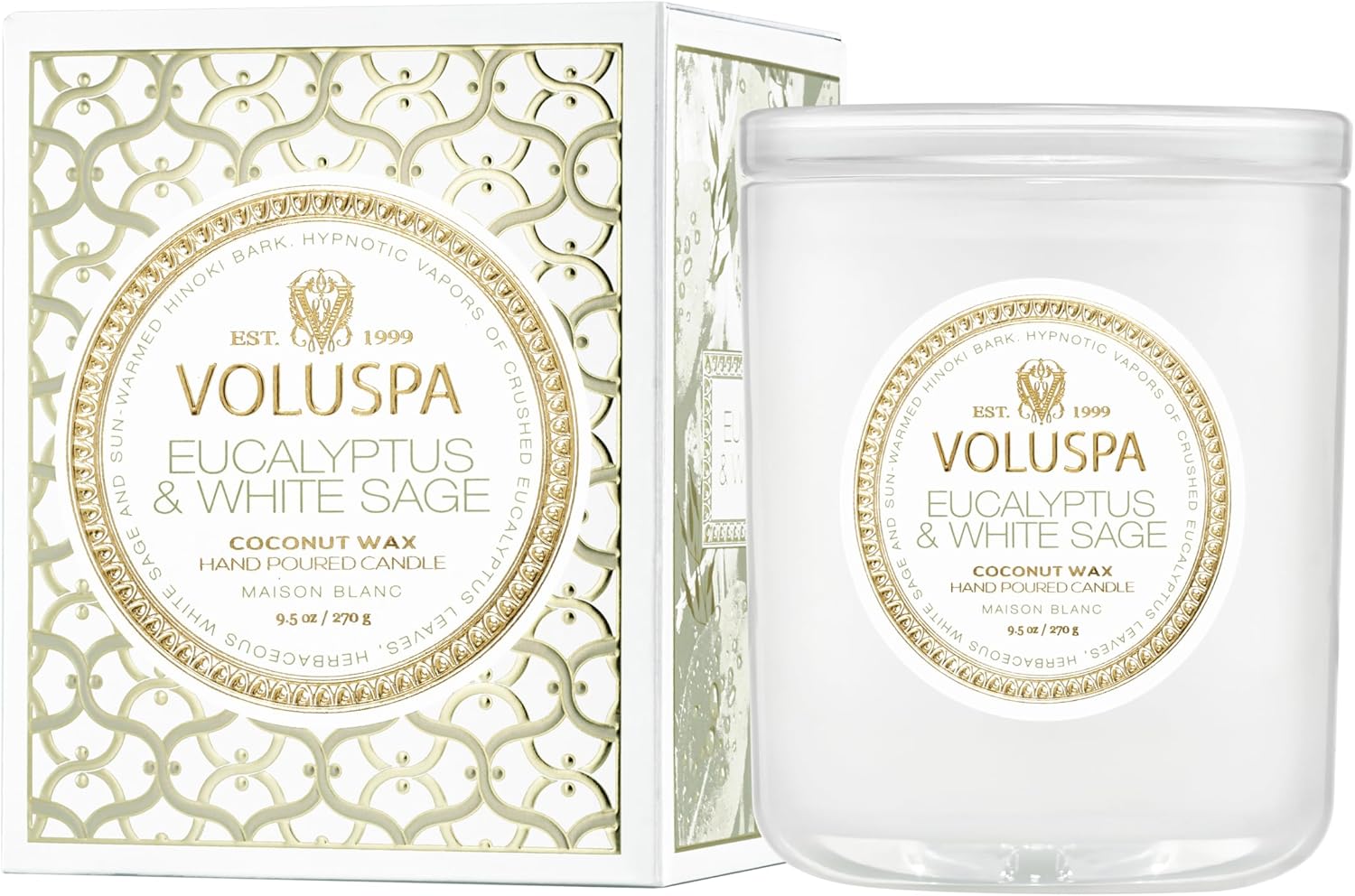 Voluspa Eucalyptus & White Sage, Classic Boxed Candle, 9.5 oz, 60 Hour Burn Time, Coconut Wax for Clean Burning, Handcrafted in the USA