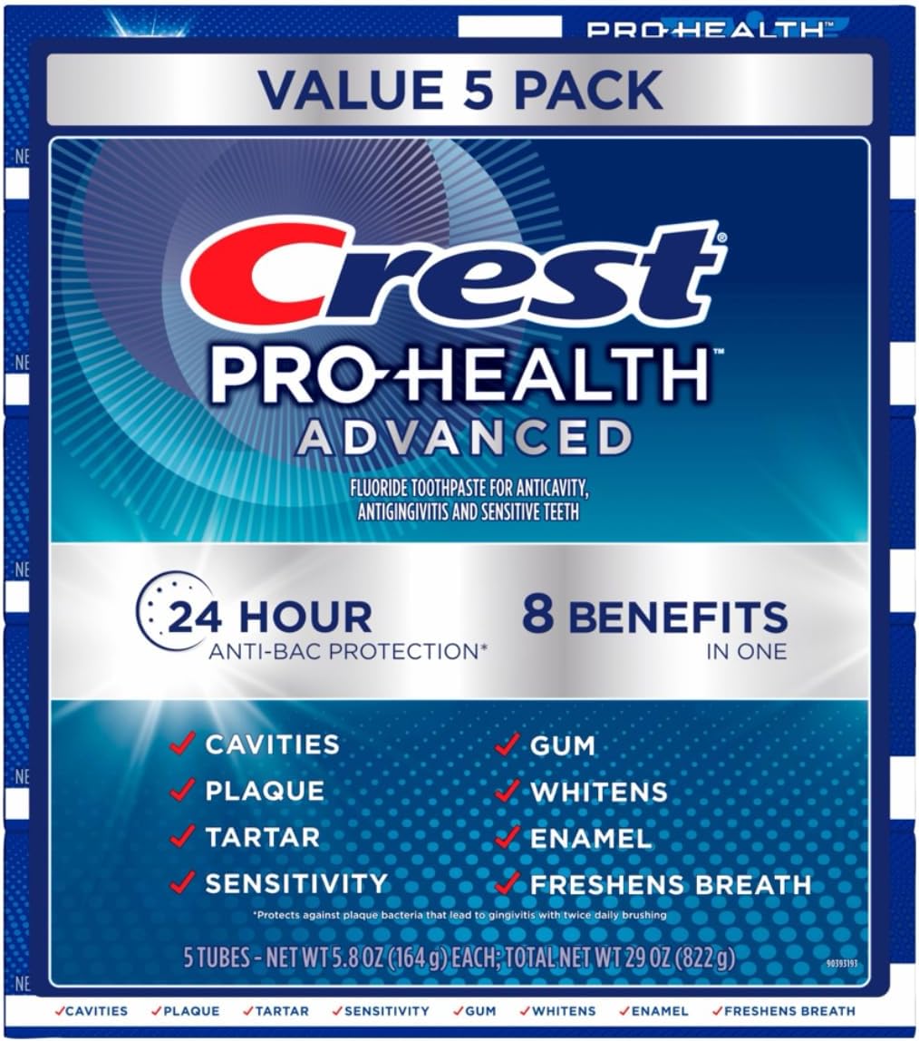 Get a powerful and all-in-one protection from Crest Pro-Health. The Pro-Health Advanced formula protects 100% of the whole mouth and helps prevent plaque growth to stop issues before they start.* Clinically proven ingredients & it protects against 8 key benefits and areas dentists check most. Features: (5) 5.8 oz Toothpaste 24 Hour Anti-Bac Protection 8 Benefits in 1 Protects 100% of the Whole Mouth