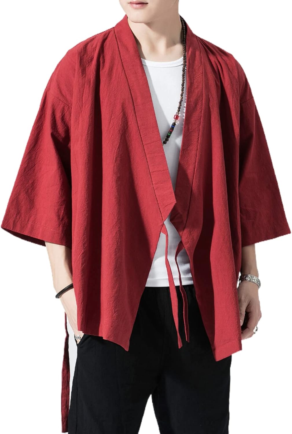 Men's Japanese Kimono Cardigan Loose Cotton Linen 3/4 Sleeve Open Front Casual Summer Shirt Jackets