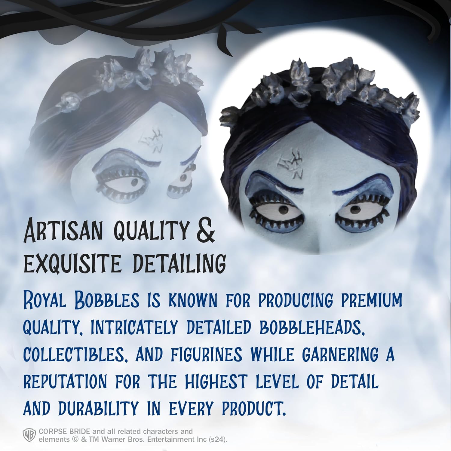 CORPSE BRIDE EMILY BOBBLEHEAD: Bring the ethereal charm of Emily, voiced by Helena Bonham Carter, from Tim Burton's stop-motion classic "Corpse Bride" to your collection. This intricately designed bobblehead features Emily in her iconic tattered wedding gown and a crown of withered blue roses.
