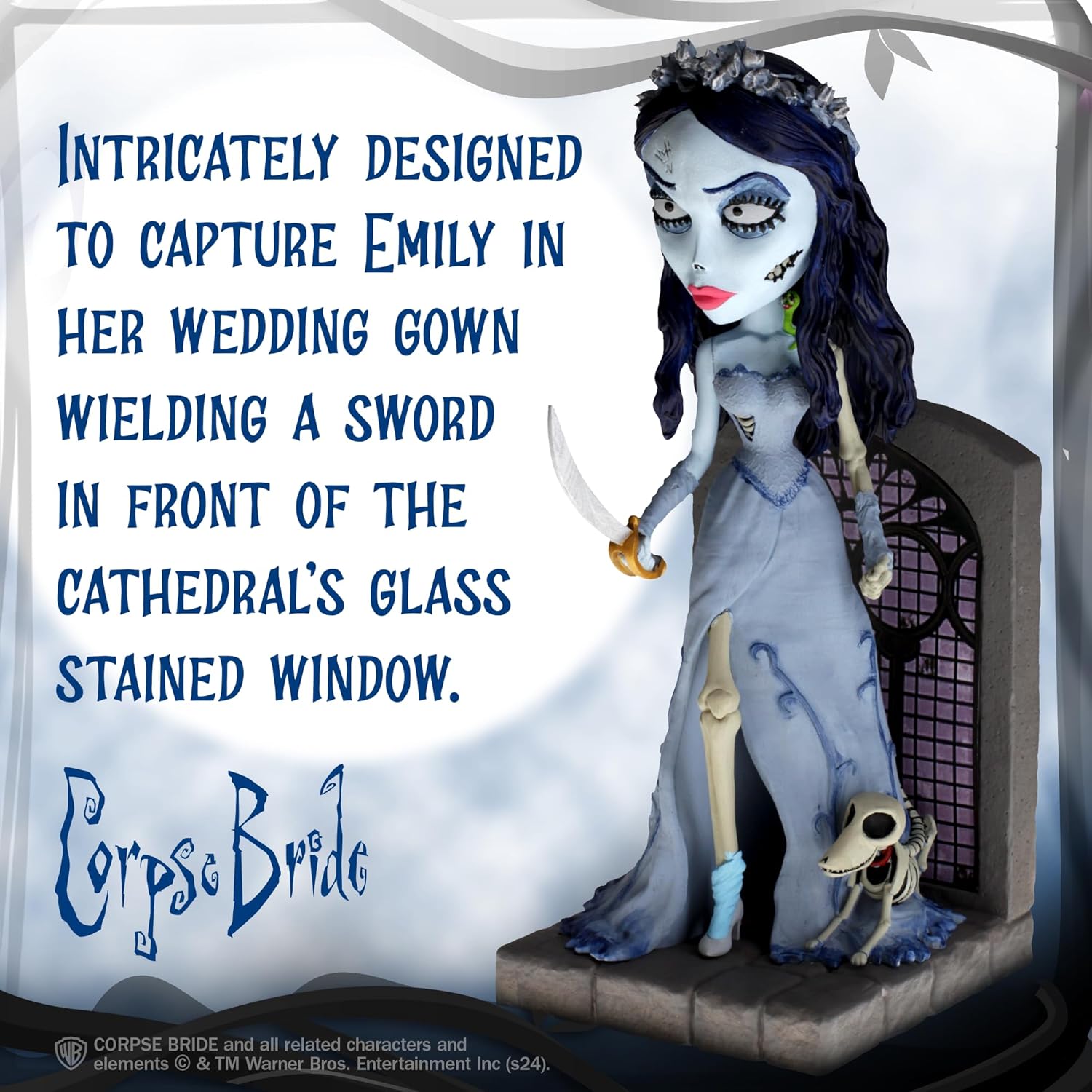 HAUNTINGLY DETAILED BOBBLEHEAD: With Maggot perched on her shoulder and Victor’s beloved and fearless former pet, Scraps, by her side, this Royal Bobbles figurine showcases Emily wielding a sword in front of the cathedral’s glass stained window.