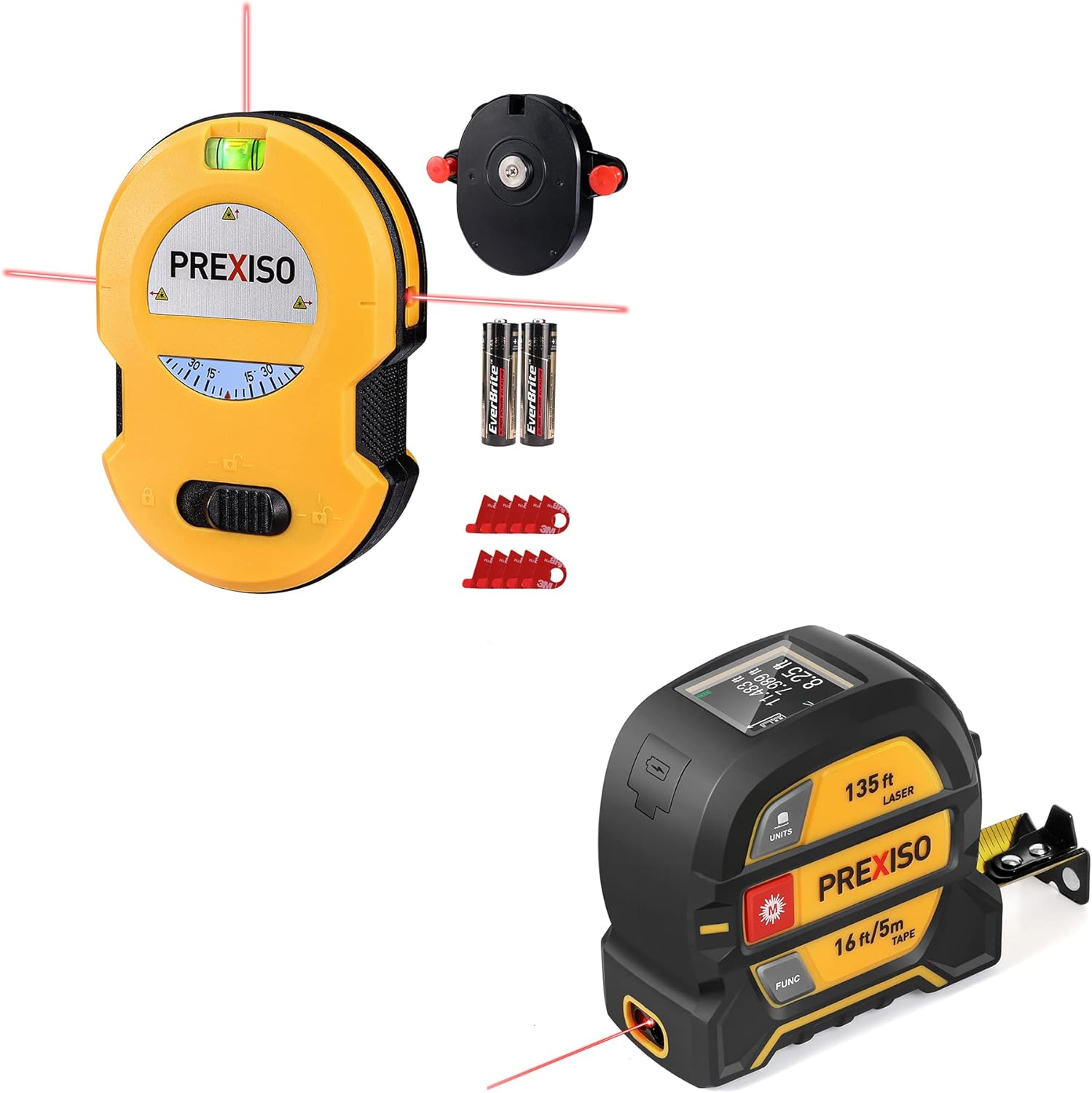 PREXISO Multi Surface Laser Level LED Light Vial, 30Ft Horizontal and Vertical Line Laser & PREXISO 2-in-1 Digital 135Ft Rechargeable Laser Tape Measure