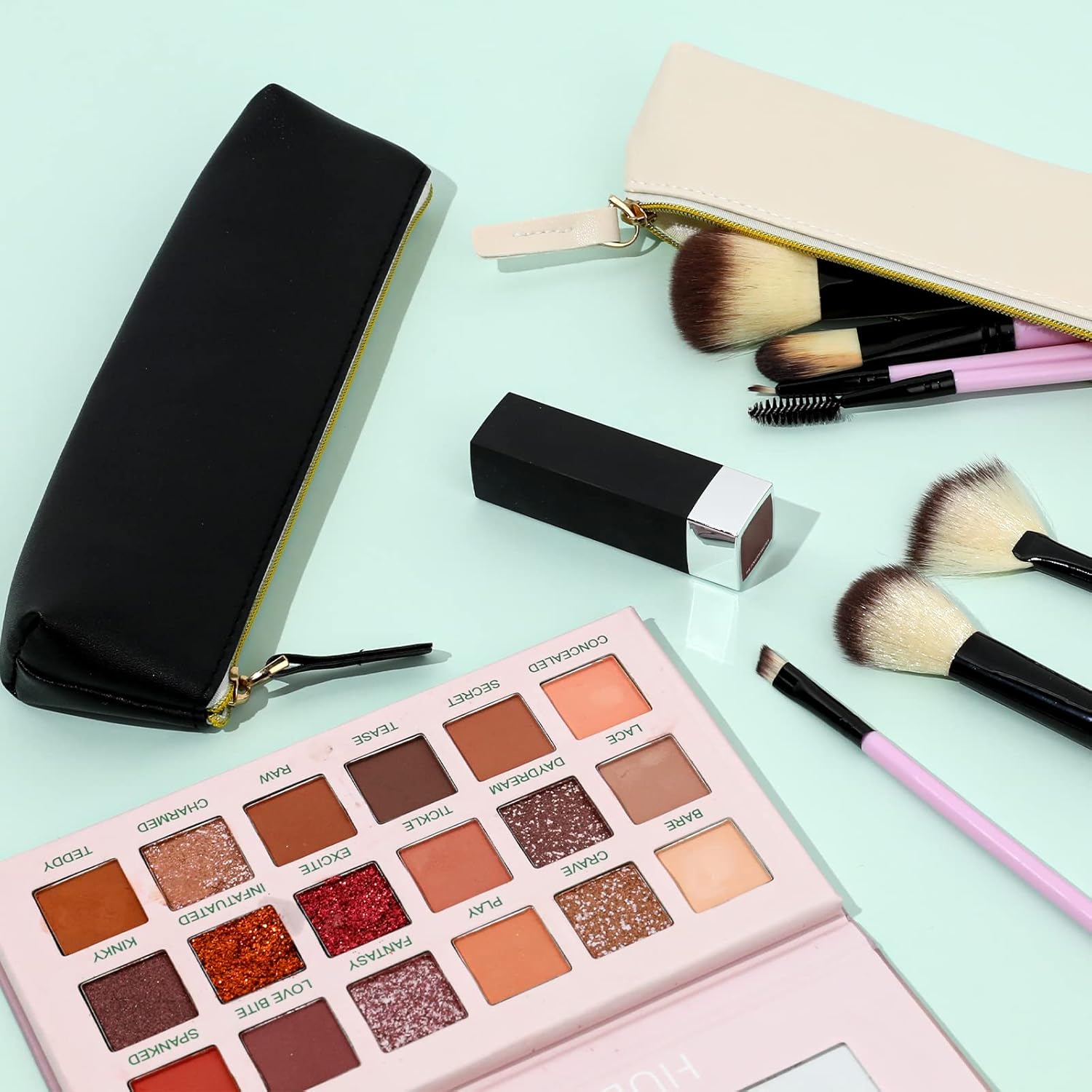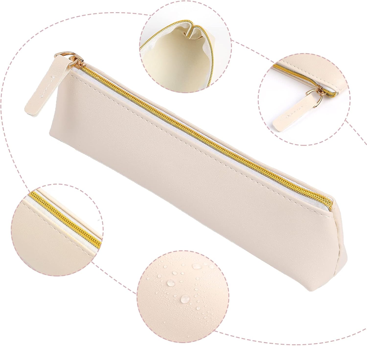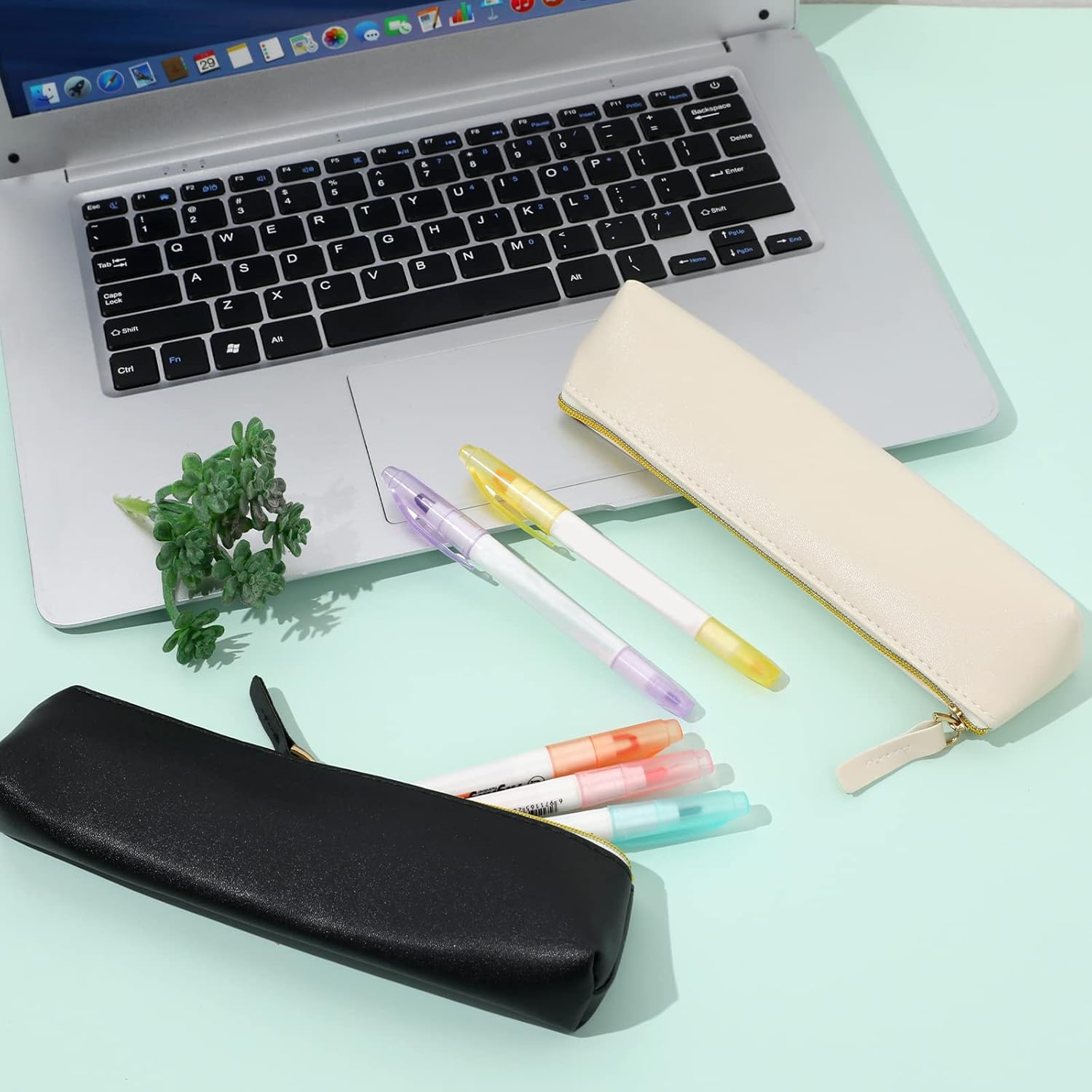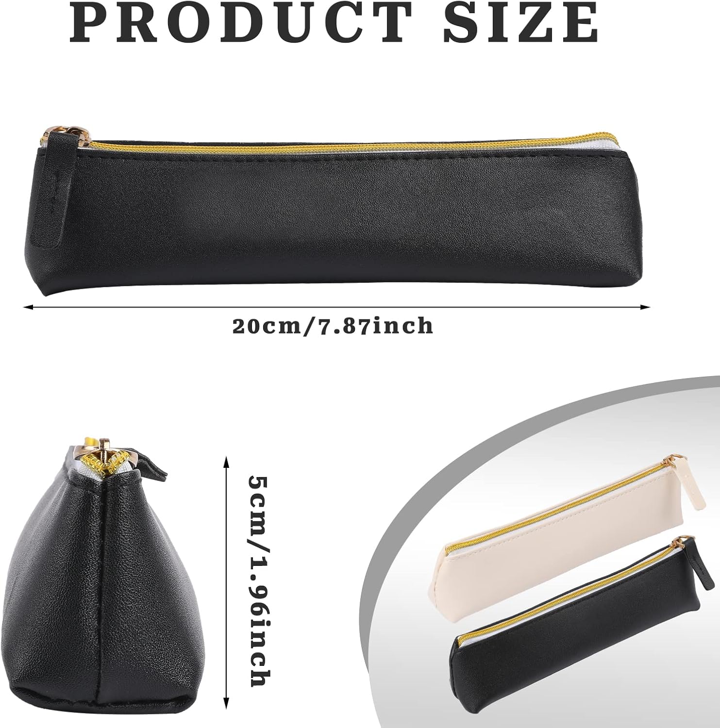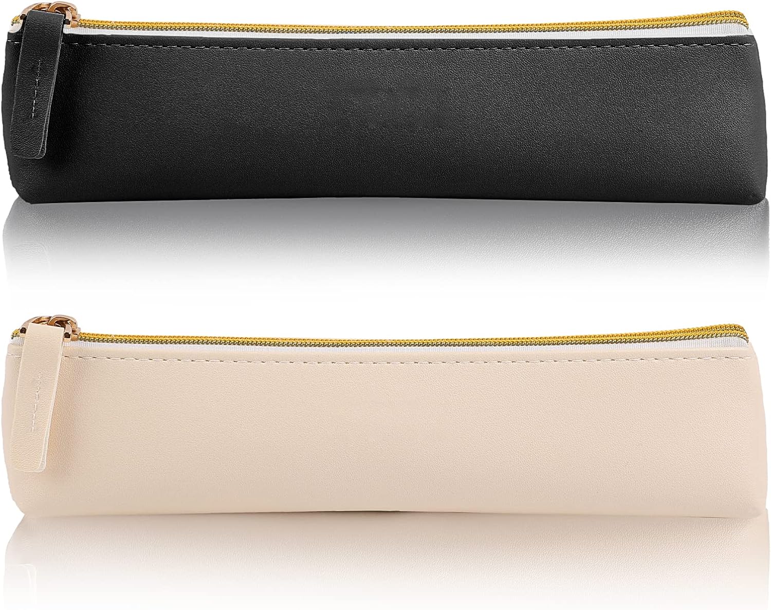 2 Pcs PU Leather Small Pencil Pouch, Small Pen Pencil Stationery Pouch Bag Slim Design Zipper Pencil Pouch for Pens, Pencils, Markers(Black&Beige)