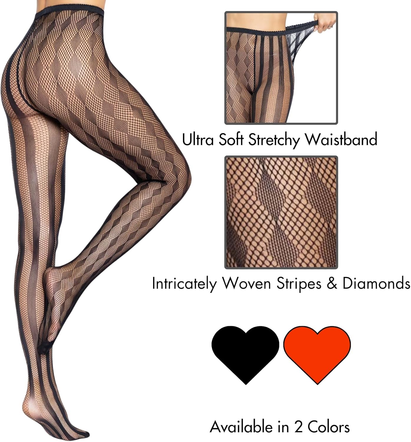 Be big top ready with the harlequin net tights by Leg Avenue. Classic fishnets with woven stripes and diamonds, these pantyhose are perfect for clown costumes, a sexy DIY Harley Quinn, or just for fun!