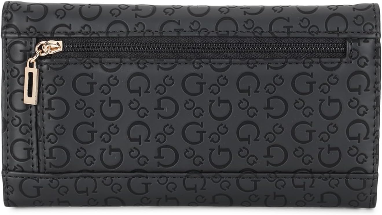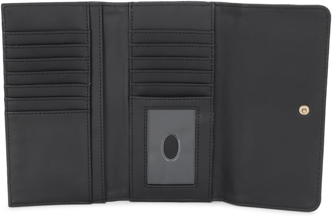 Tri-fold slim clutch wallet - Debossed logo design - Smooth faux-leather - Fold-over flap closure