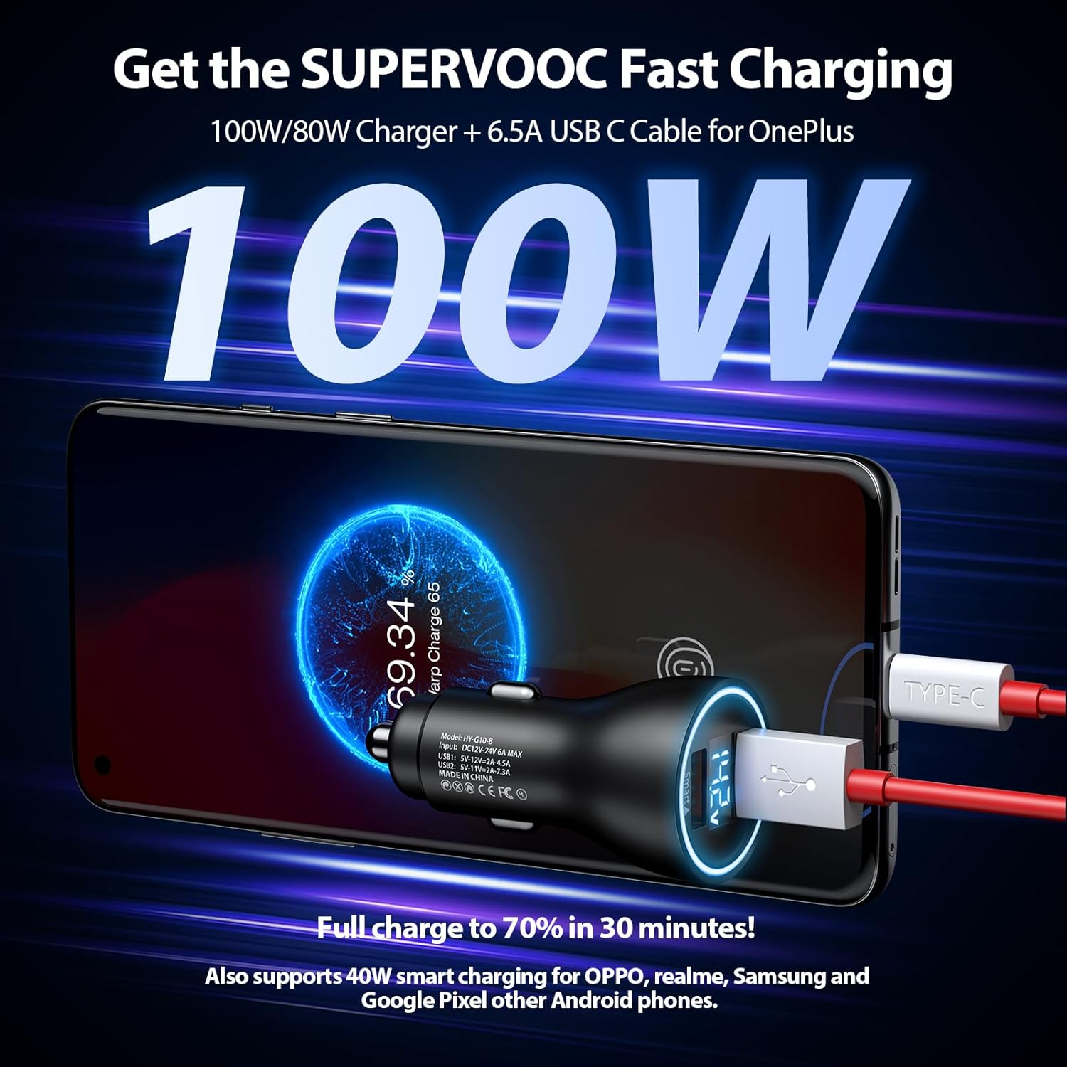 for Supervooc Car Charger for OnePlus : This USB Car Charger supports QC/AFC/FCP/VOOC/Dart charging protocols, so you can charge your phone, tablets, laptops, portable devices etc. This usb car charger supports 100 W Max, supports 100W charge for OnePlus 13/10T, 80W charger for OnePlus 13R/12R/12/11/10 Pro/Nord 2T, support 67W for OnePlus Open/ Pad, supports 65 W Warp Charger for OnePlus Nord 2 5G/9 Pro 5G/9 5G/8T; 50W fast charging for OnePlus Nord N30 5G, 33W fast charger for OnePlus Nord N300 5G/Nord N20 5G, supports 30 W Warp Charger for OnePlus Nord/8 Pro/8/7T Pro/7T/7 Pro