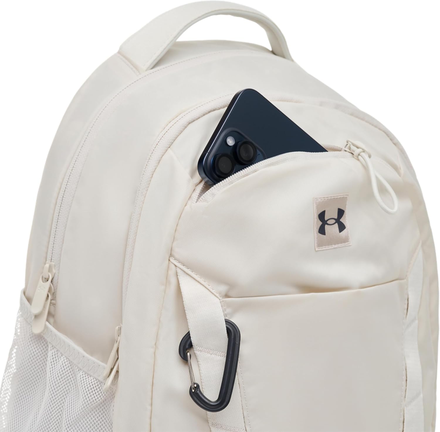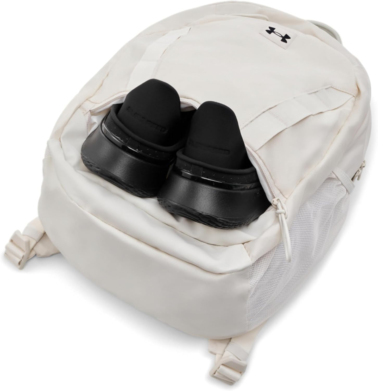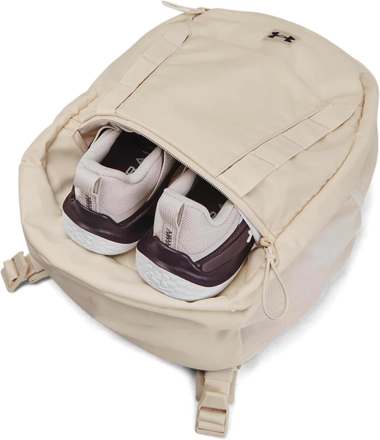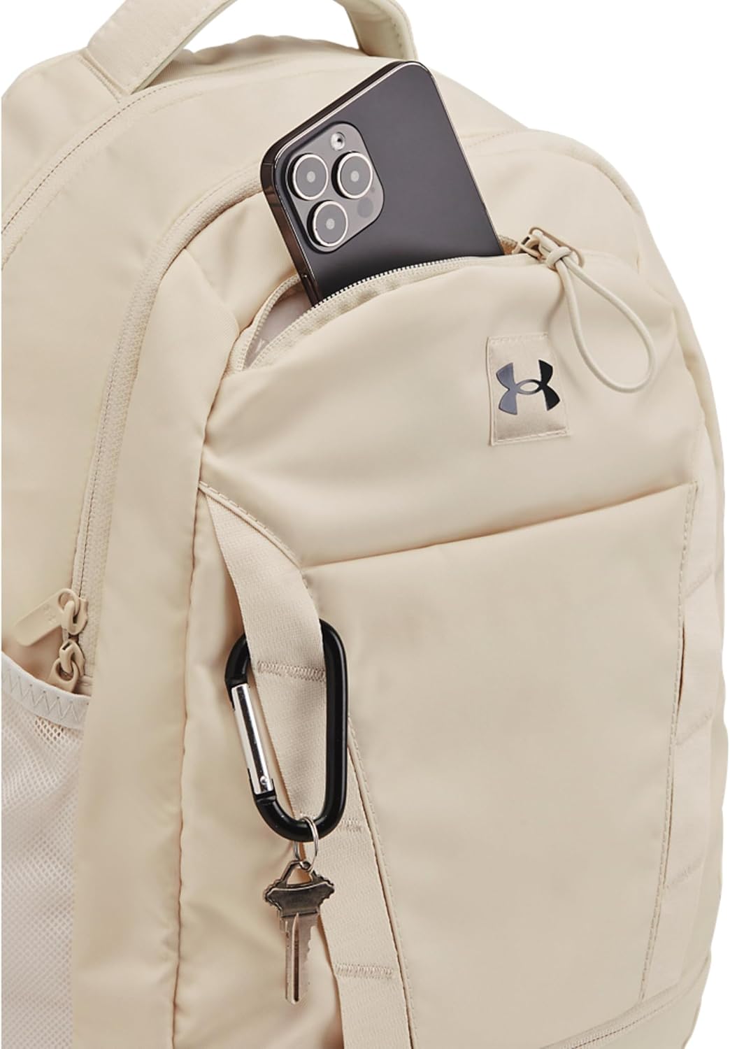Ergonomically constructed for the female back with body-mapped back panel for comfort & unrestrictive carry . Water-resistant UA Storm technology keeps your stuff dry . Adjustable, ergonomically-shaped shoulder straps for added comfort . Soft-lined laptop compartment—holds up to 15" MacBook Pro® or similarly sized laptop . 1 front valuables pockets with hair tie zipper pulls & 1 large front slip pocket Large, expandable front laundry/shoe pocket at bottom of bag .