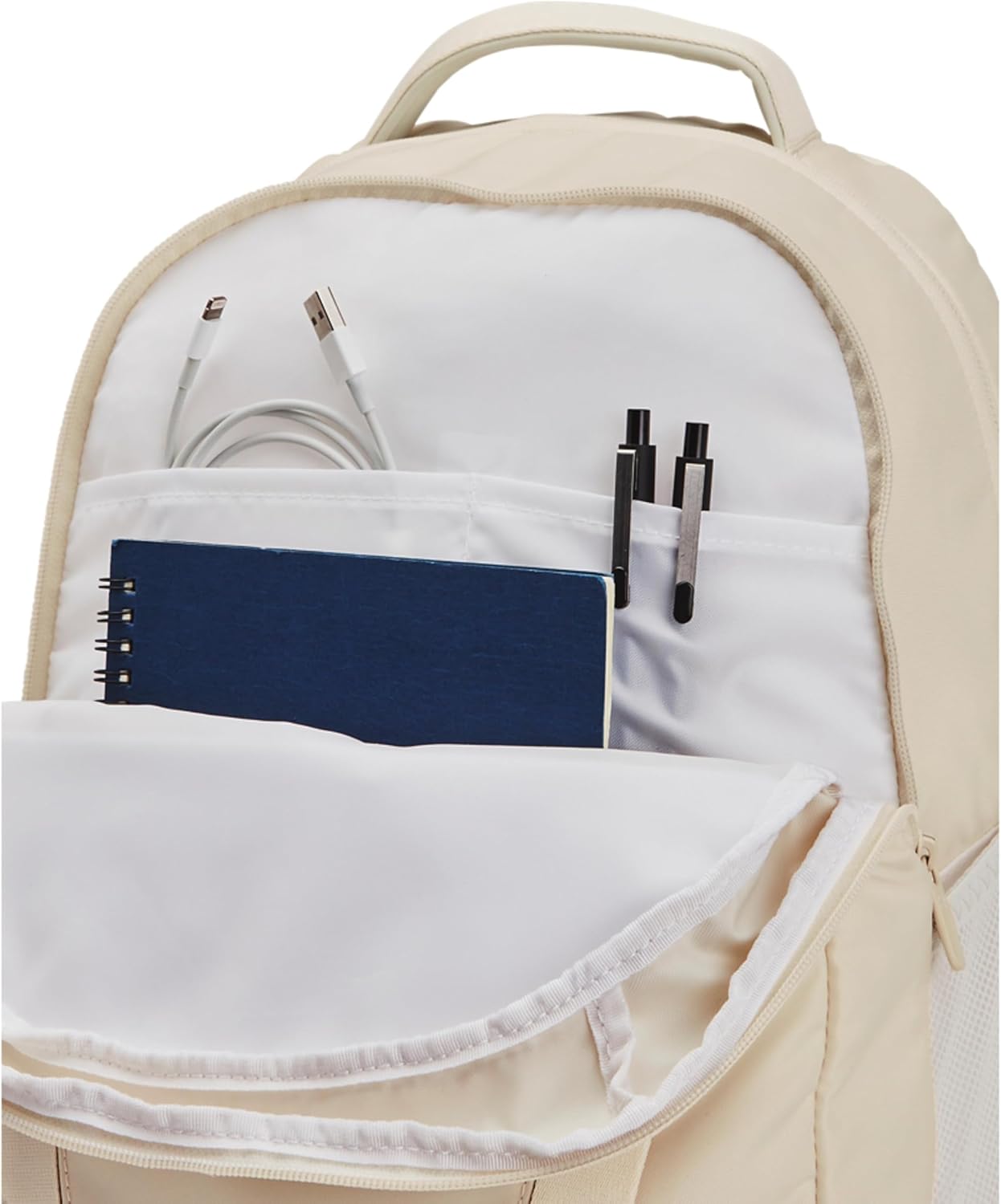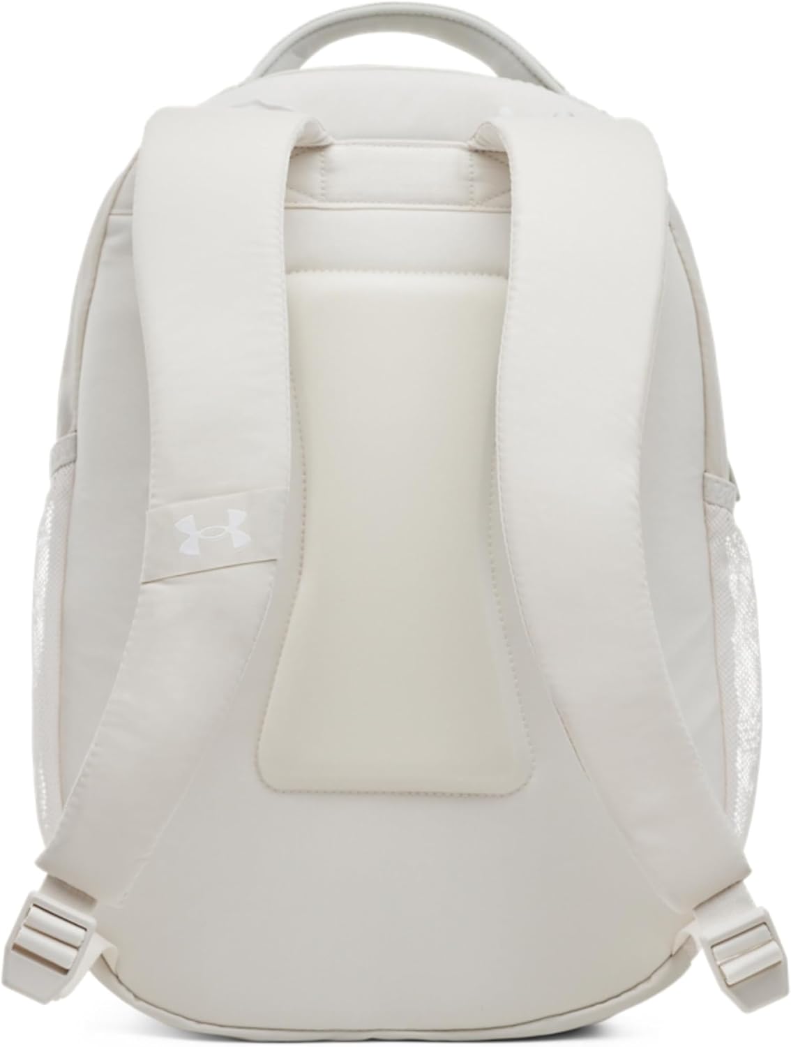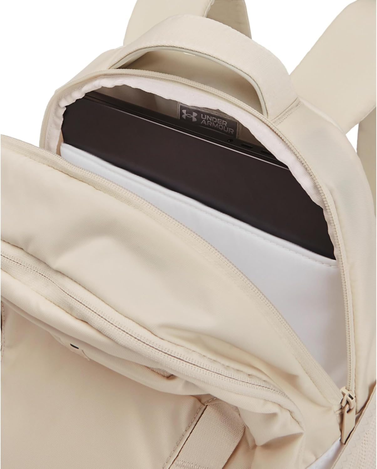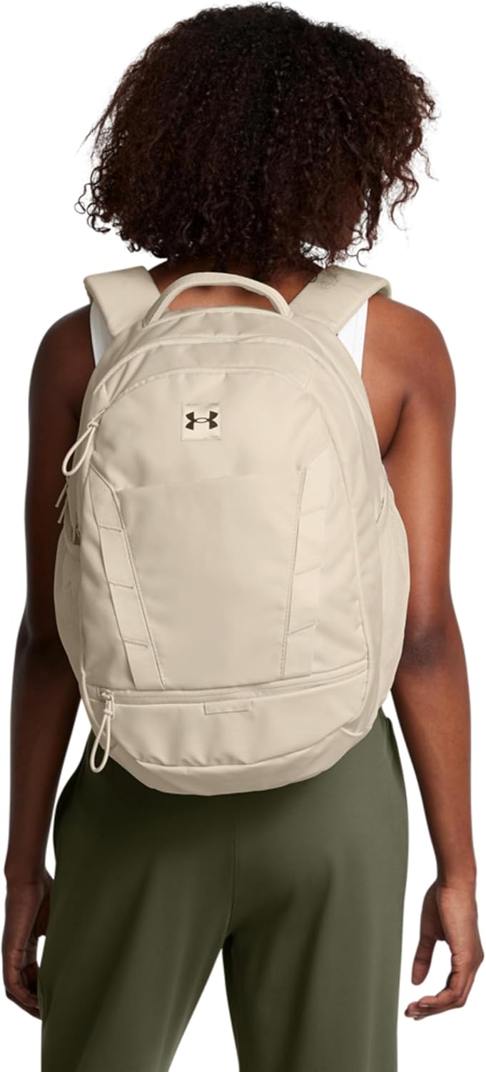 Ergonomically constructed for the female back with body-mapped back panel for comfort & unrestrictive carry . Water-resistant UA Storm technology keeps your stuff dry . Adjustable, ergonomically-shaped shoulder straps for added comfort . Soft-lined laptop compartment—holds up to 15" MacBook Pro® or similarly sized laptop . 1 front valuables pockets with hair tie zipper pulls & 1 large front slip pocket Large, expandable front laundry/shoe pocket at bottom of bag .