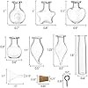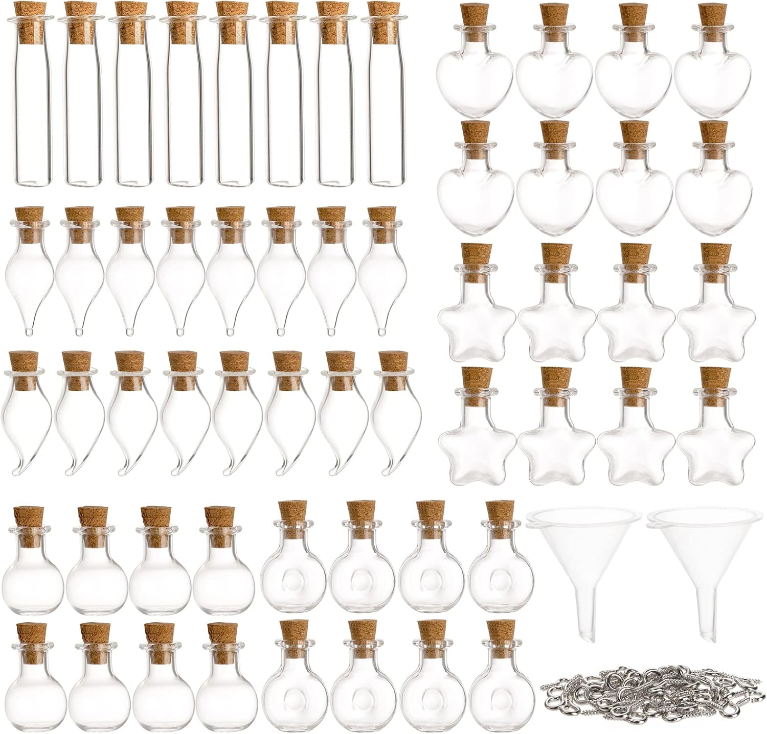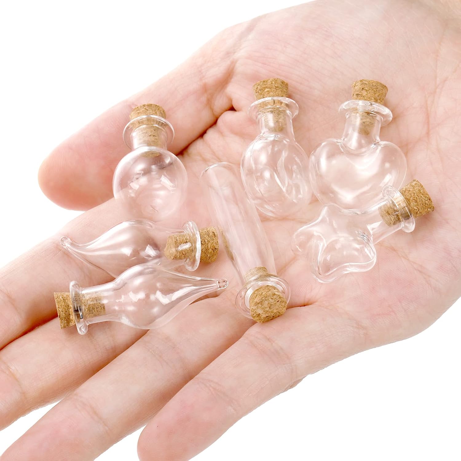 Package includes 56 mini glass bottles in 7 shapes, 56 cork lids, 56 eye screws. The quantity and varied shapes can meet your crafting needs. These decorative glass bottles are designed exclusively for crafting purposes. They are not intended for storage or preparation of any regulated materials.