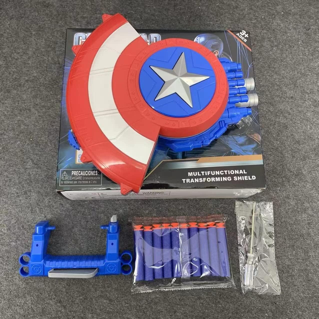 ☀Long Distance Launch This Captain Shield design can shoot up to 7.8 meters, it also can fire up to 6 soft darts in quick succession,you just need to press to shoot. Cool styling design will definitely make children like it, so enjoy the fun of your parent-child interaction with it!
