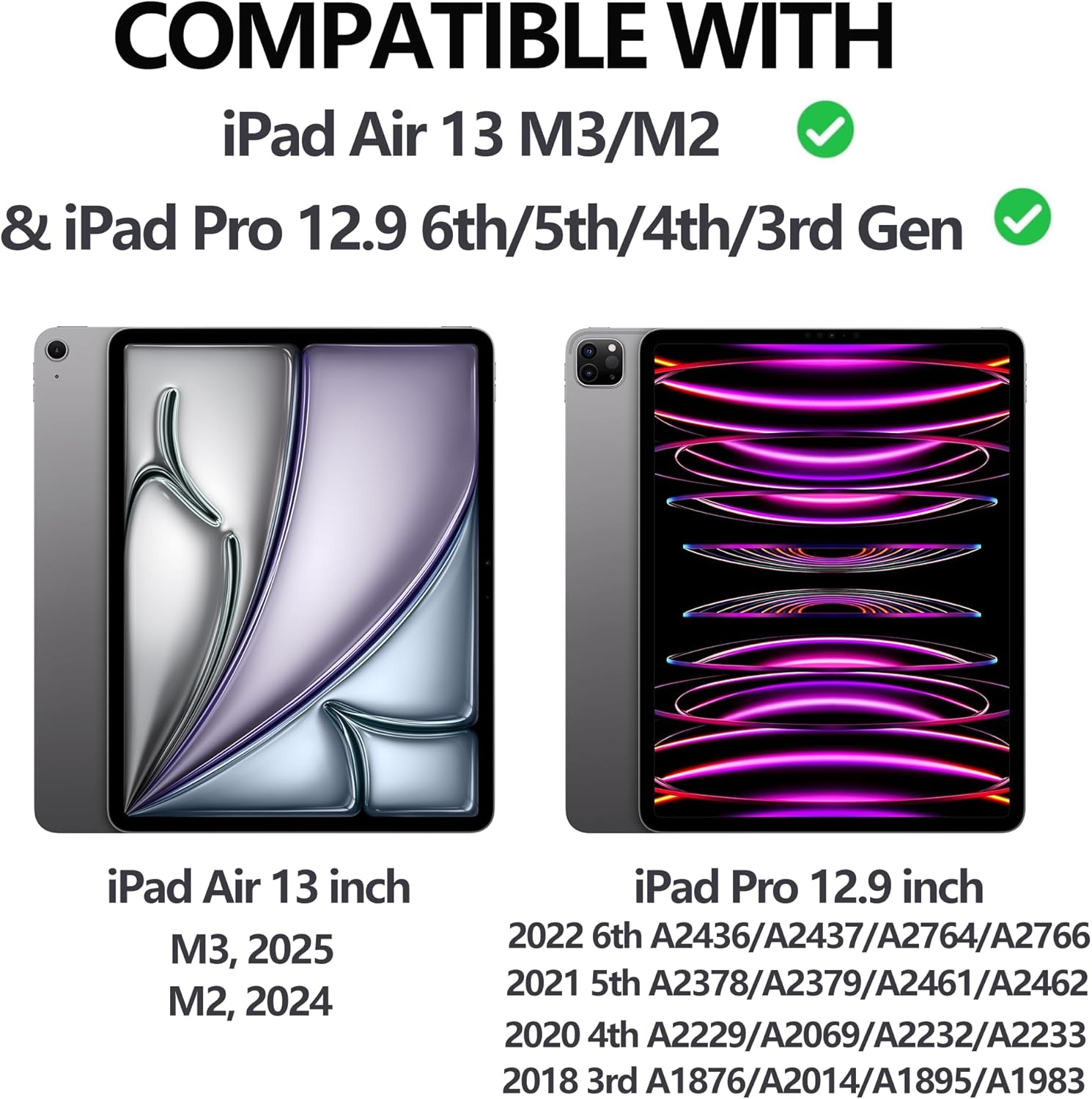【iPad Pro 12.9 inch Case with Keyboard】The case with keyboard is compatible with iPad Air 13 (M3 2025, M2 2024), iPad Pro 12.9 6th 2022/5th 2021/4th 2020/3rd 2018 Gen. Pro 12.9 inch Model No: 6th Generation (A2436, A2437, A2764, A2766), 5th Generation (A2378, A2379, A2461, A2462), 4th Generation (A2229, A2069, A2232, A2233), 3rd Generation (A1876, A2014, A1895, A1983).