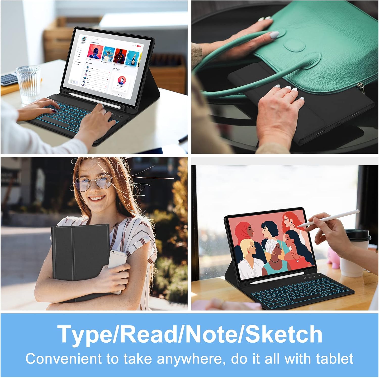 【Adjustable 7-Color Backlight & 3 Levels Of Brightness】Bluetooth keyboard for ipad pro 12.9 has 7 colors of backlight, 3-level for opening backlit and adjusting brightness level. Soft backlight can see all the keys and improve work efficiency at night. For ipad air 13 inch case with keyboard makes typing fun.
