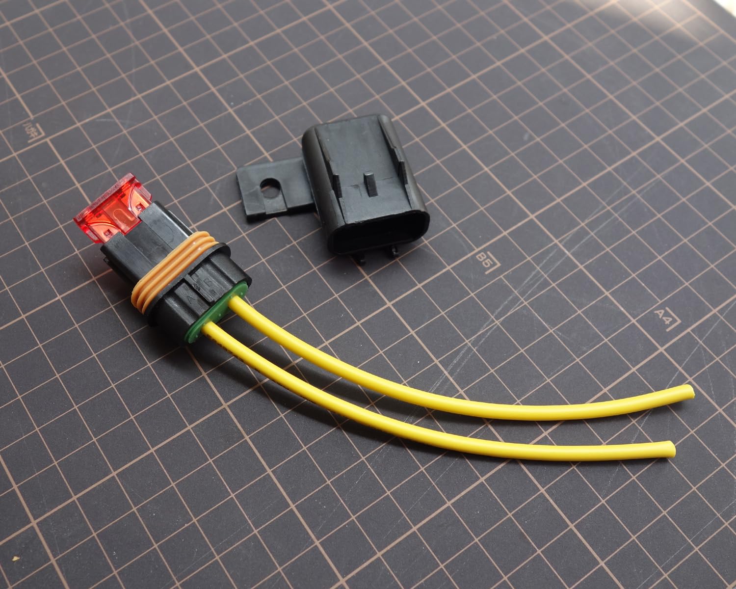 Fuse and fuse holder are included. Ring terminal attached on power and ground ends.