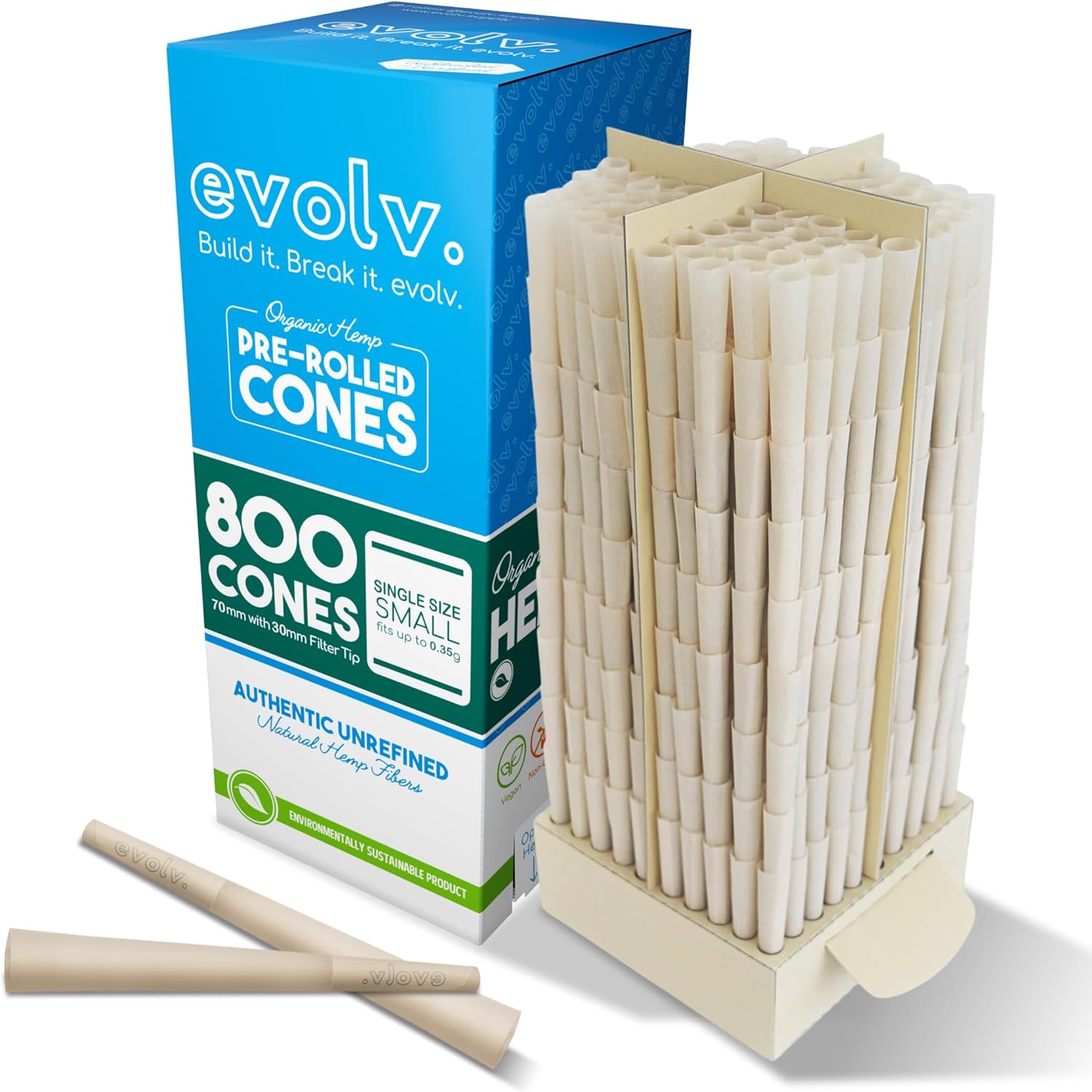 Evolv Organic Hemp Pre Rolled Cones Rolling Paper | Single Size (Dog Walker) 70/30mm | 800 Count Case | Unbleached, Slow Burning Preroll Cones | Artisan Crafted Rolling Cone | Size: Small (Designed Small for Personal Use)