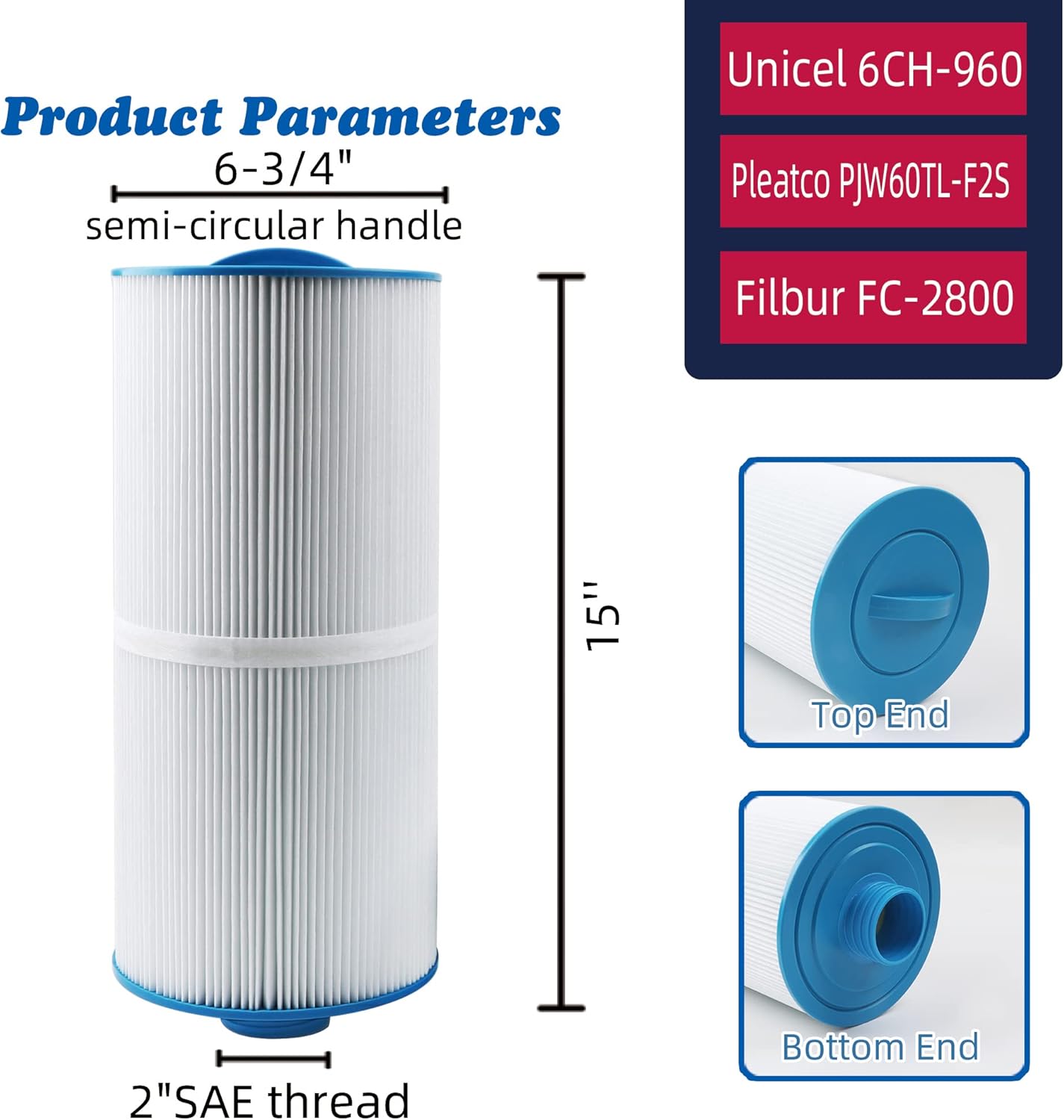 Spa Filter 6CH-960 Replaces Jacuzzi Filters J-300 J-400, Unicel 6CH-960, Pleatco PJW60TL-F2S, Filbur FC-2800, 6540-476, 6540-383, Hot Tub Filter with Closed Handle(Not be Removed)- 2 Pack