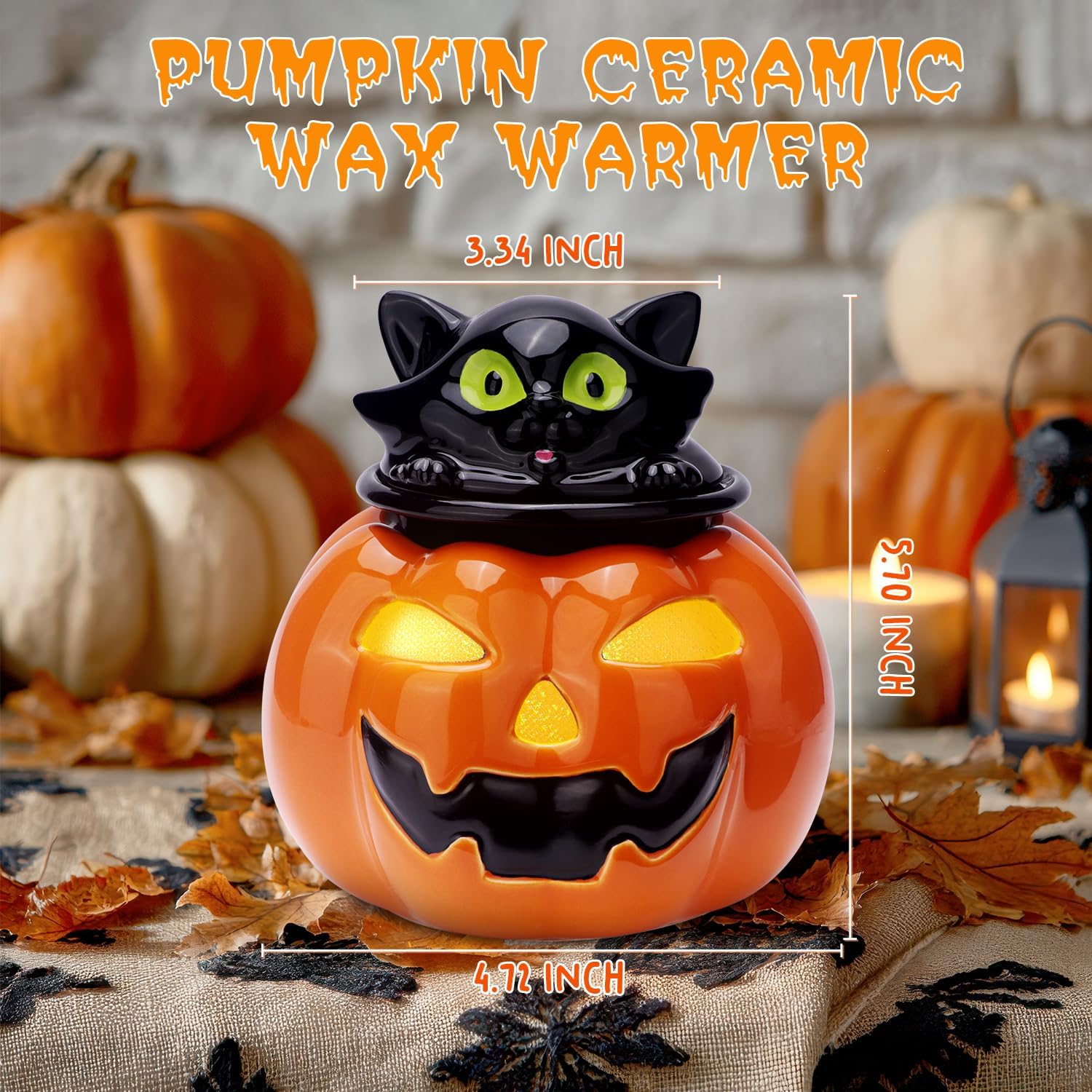 El detalle malvado de la calabaza crea un centro de atención llamativo, convirtiéndolo en una gran adición a cualquier reunión espeluznante o celebración de Halloween. Simplemente coloca tus ceras favoritas en el plato, enchufarlo y disfruta de los encantadores aromas que transforman tu hogar en un acogedor refugio.