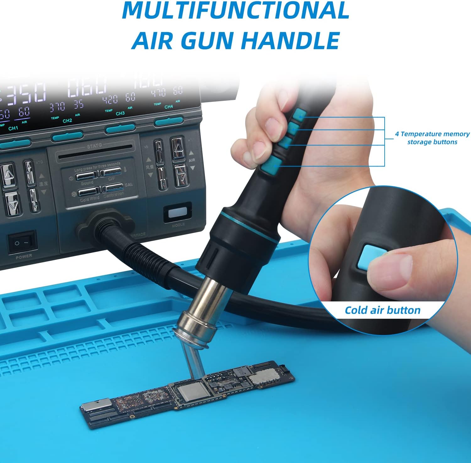 CONTROLLABLE HANDLE: The Hot Air Station handle has 4 temperature memory storage buttons and cold air buttons, and you can remotely adjust 4 temperature storage and cold air with just one button.