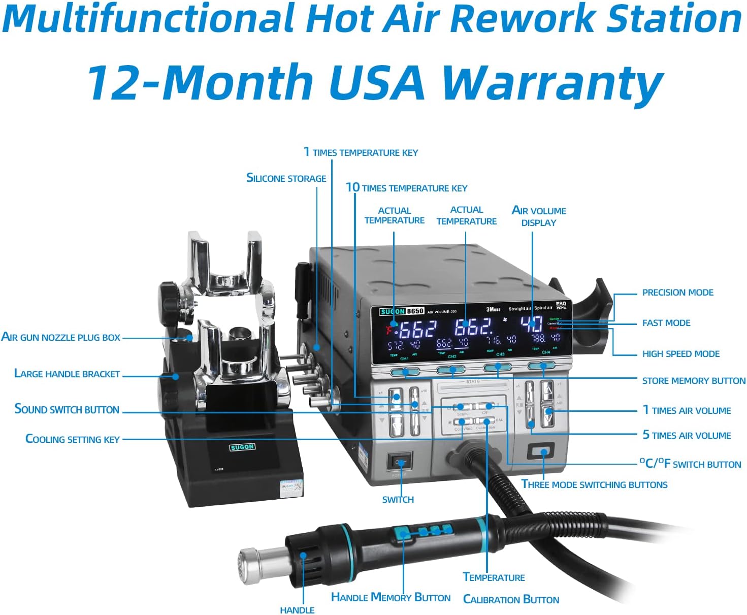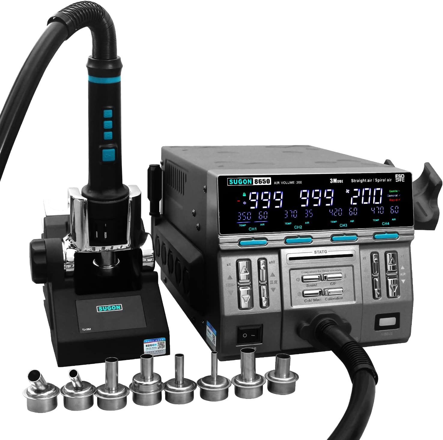 SUGON 8650 Hot Air Rework Station 1300W,3 Different Heating Modes,℃/℉, Temperature 212°F-999°F,8 Air Nozzles, Air Volume 1-200,4 Temperature Memory Storage, Automatic Sleep, Nozzle Replacement Bracket