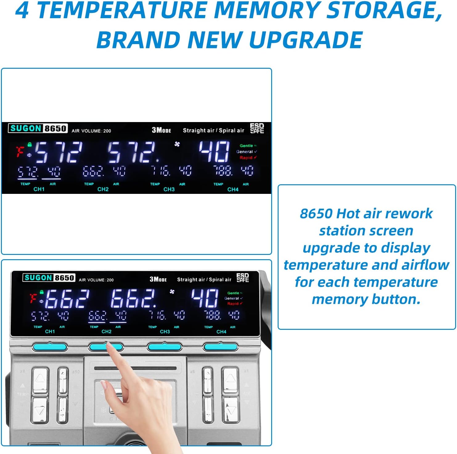 4 TEMPERATURE MEMORY STORAGE: SMD rework station is newly upgraded, adjust the appropriate temperature and air volume, long press the temperature storage button, and you can save, each temperature memory stored value will be displayed on the screen, do not have to forget.