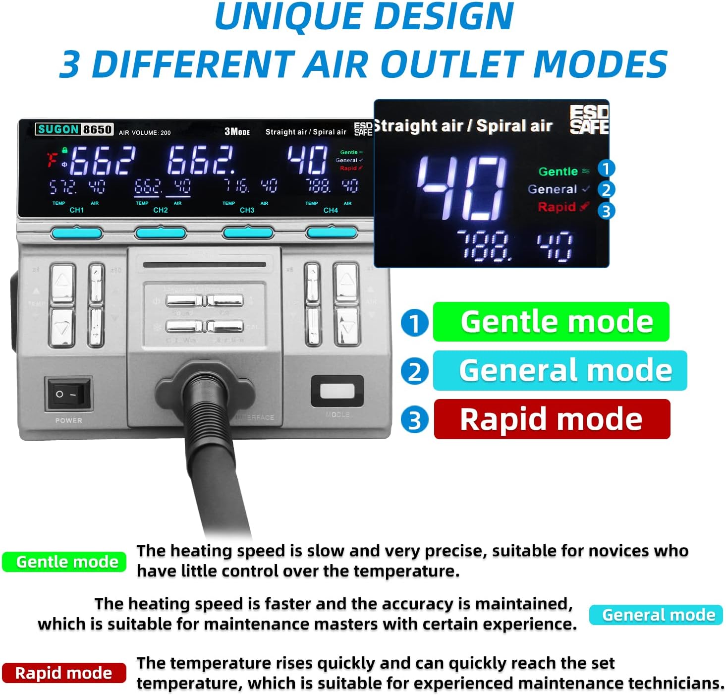 NEW FEATURE: Hot Air Rework Station has 3 different air outlet modes, gentle, general, and rapid, each mode has a different airspeed, choose different modes according to different habits.