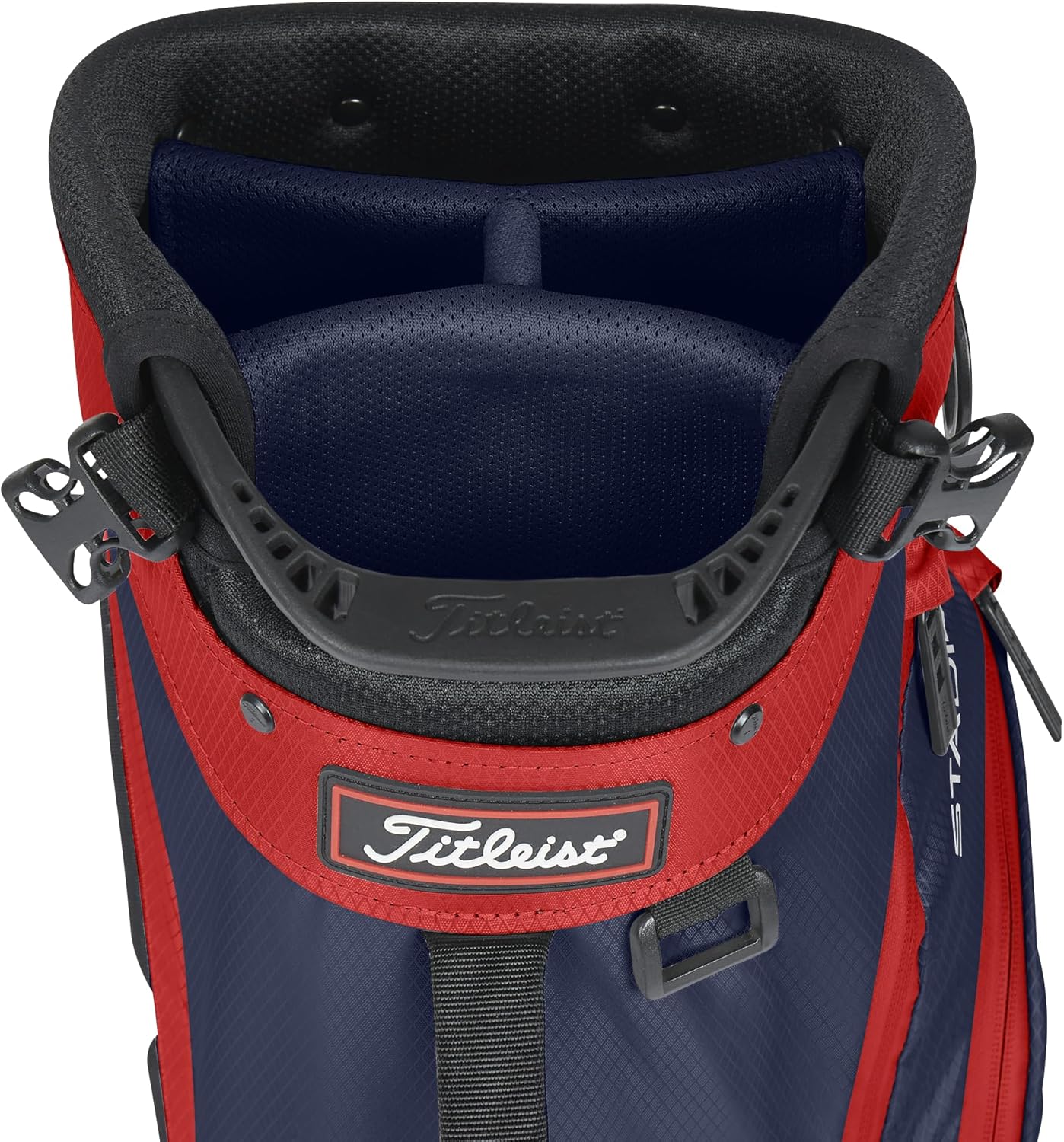 Titleist 2023 PlayersA 4 StaDry Golf Stand BagFeatures: * StaDrya,, waterproof construction is seam sealed to keep contents dry * 4-way low profile top helps keep clubs organized and separated for easy access * High-grade aluminum legs and hinged bottom for stability and durability * Legs held in place when not in use wih single hook-and-loop strap * Removable premium double strap system for balance and carrying comfort * If used on cart, cart strap can be run through handle for secure fit * Number of Pockets: 6, including: * Pockets are fully seam-sealed and have YKK zippers * Ball pocket with removable panel for customization * External, lined drink sleeveA with drain port * Full length, wide access apparel pocket * Velour-lined accessory pocket * Horseshoe-style tee pocket * Accessory pocket * Pen sleeve * TowelA ring * 2 Velcro glove patches * External umbrella holder * Includes matching rainhood