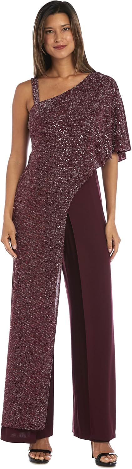 Step into the spotlight with this stunning formal jumpsuit from R&M Richards, designed for those who love effortless elegance with a touch of shimmer. This one-shoulder masterpiece features a cascading sequin overlay that drapes beautifully, creating a luminous effect with every movement. A hidden shoulder strap offers added support ensuring a secure yet stylish fit. The flowing wide-leg pants provide comfort and sophistication, making this jumpsuit a go-to for weddings, evening soirées and special celebrations. Whether you're dancing under the stars or making a grand entrance this showstopping piece guarantees you'll shine with confidence.