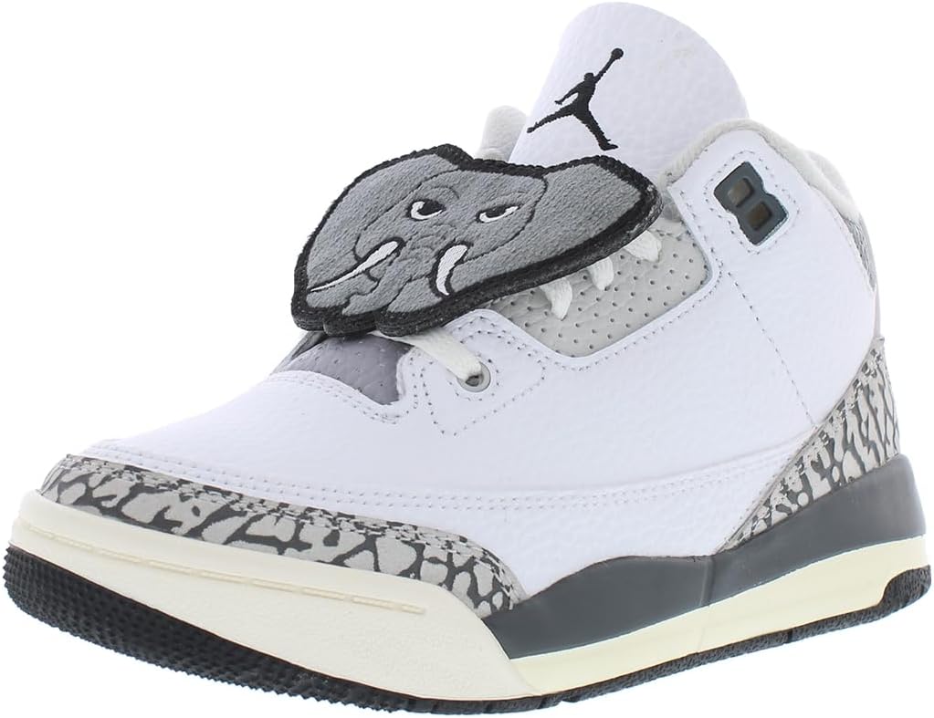 El Preschool Air Jordan 3 Retro presenta una parte superior de cuero con detalles perforados en la lengüeta y el collarín. Cuenta con un collarín acolchado, un logo Jumpman bordado en la lengüeta y estampado de elefante en la punta y la suela. La lengüeta trasera muestra el logotipo de Nike, mientras que la parte trasera exhibe los logos Jumpman y Air. Cordones planos de algodón, entresuela de goma, unidad Air-Sole visible y suela de goma completan el diseño. Disponible en Blanco / Negro Hierro / Gris Ceniza Claro, este zapato está hecho de cuero.