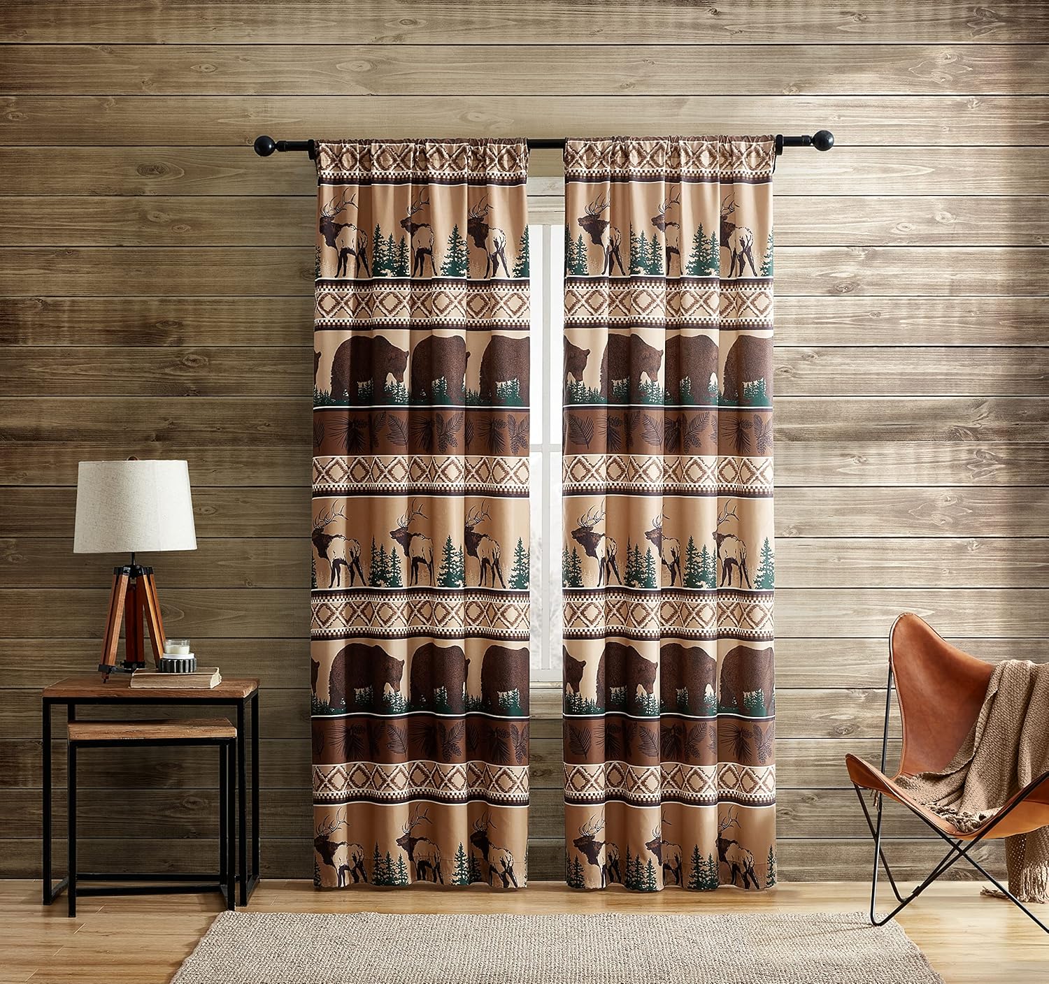 Beatrice Home Fashions Bear Mountain Privacy Window Curtains with Rod Pocket, 2-Panel Set Featuring Bear Elk Rustic Log Cabin Lodge, Each Panel Measures 38" W x 84" L, Brown