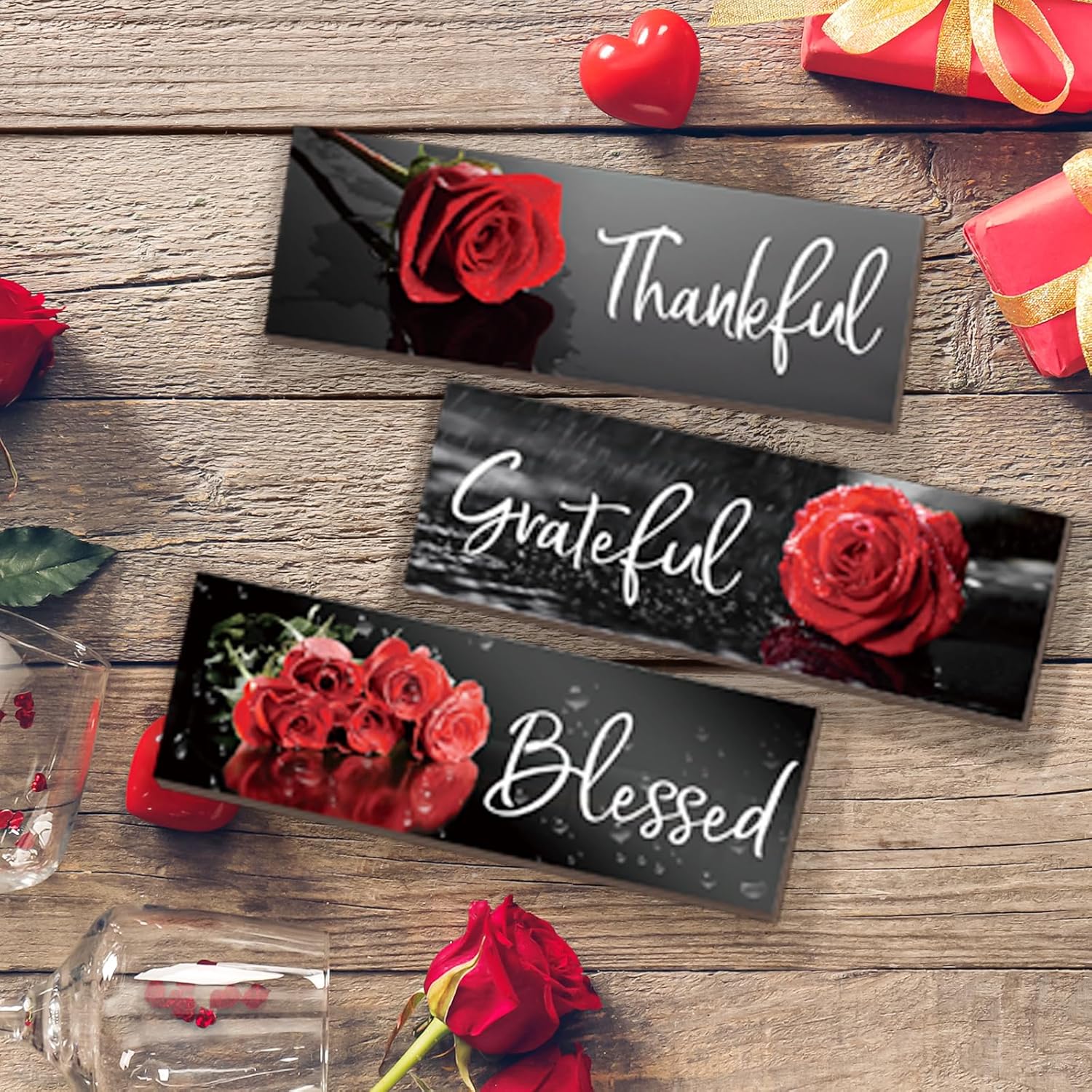 3 Pcs Red Bathroom Decor Rose Wall Art Inspirational Flower Wooden Signs Red and Black Bathroom Office Wall Decor with Thankful Grateful Blessed Quotes for Women Bedroom Kitchen(12x4 Inch)