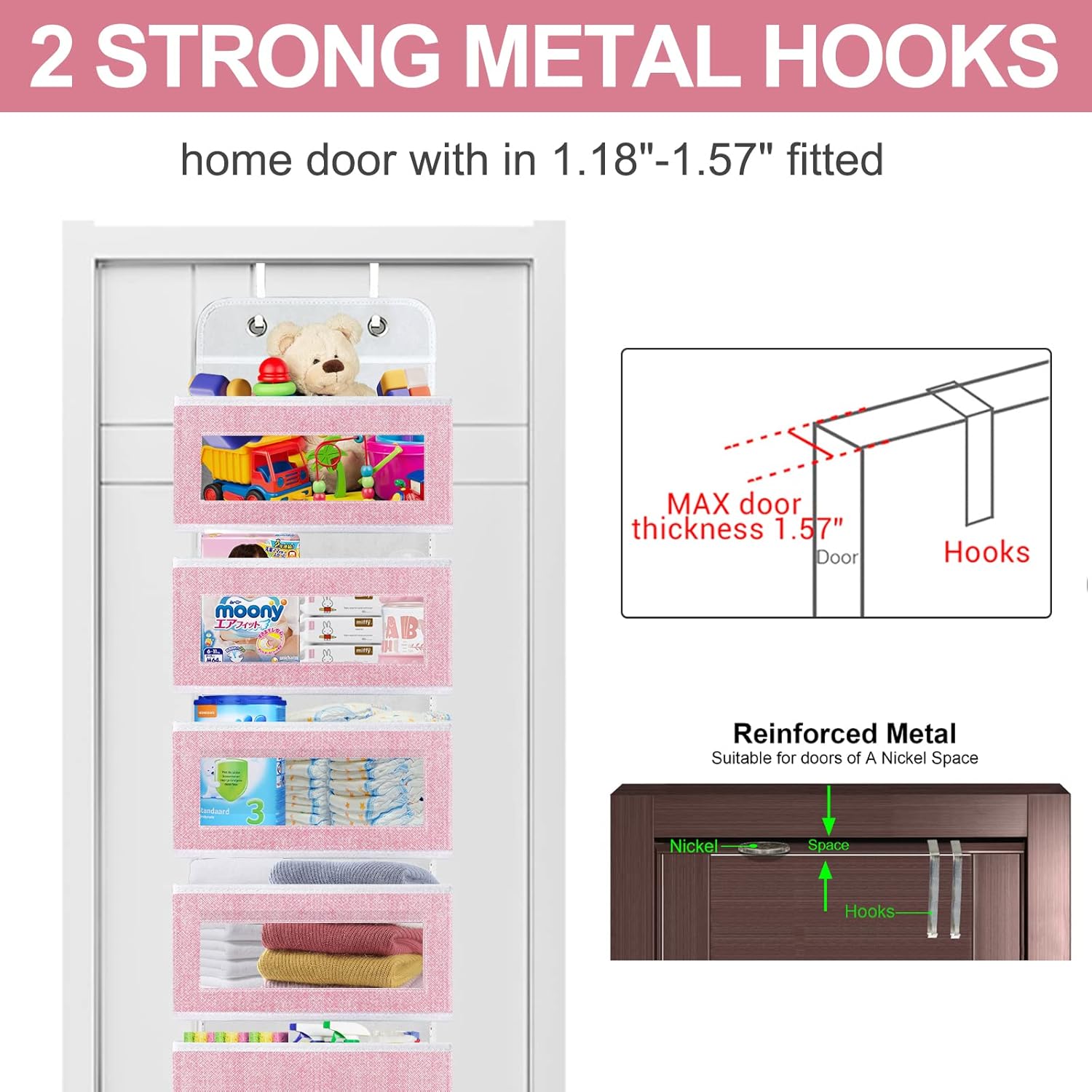 🎀 LARGE CAPACITY: The size of this 5 pocket pink over the door organizer is 12.2”x5”x50”, each pocket measures 12.2”x5”x5.9”, can be used over back or behind of the door to storage diaper,baby clothes,underwear,socks,toilet paper,etc.