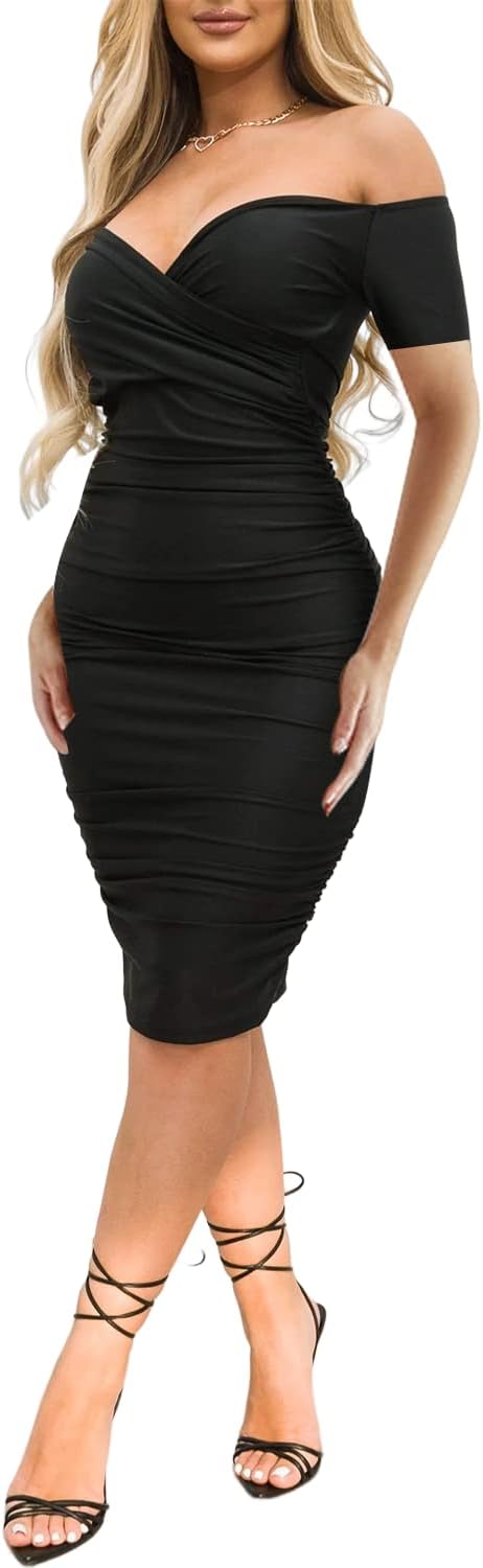 Ekaliy Women's Sexy Off The Shoulder Midi Dress Ruched Bodycon Dresses