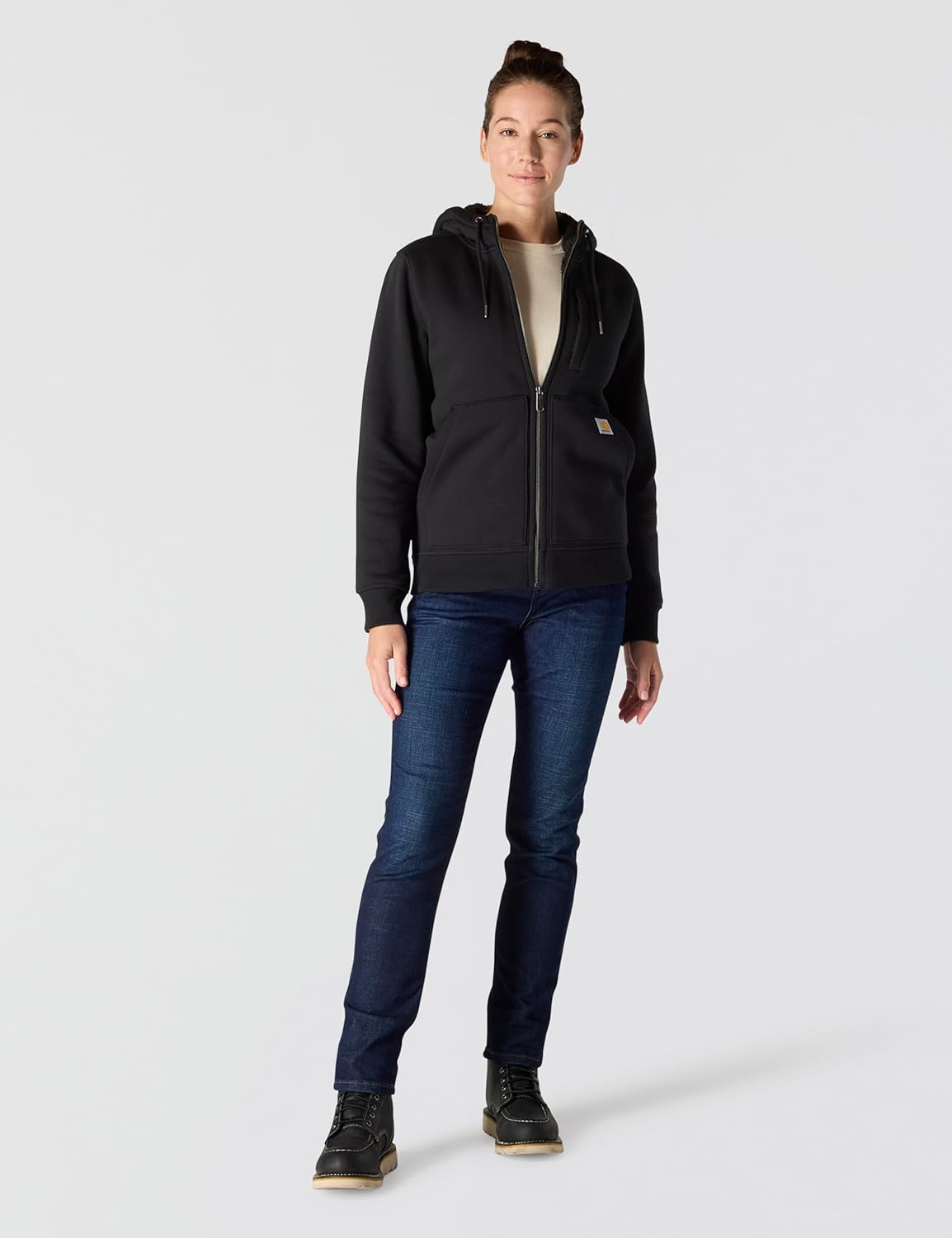 Chilly days call for the warmth and softness of this women's hooded Carhartt sweatshirt. A thick sherpa fleece lining adds a cozy feel to its midweight cotton build. The relaxed fit sits closer to the body than Carhartt's loose fit but still offers room t