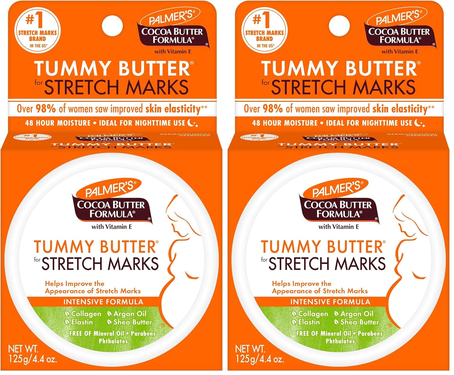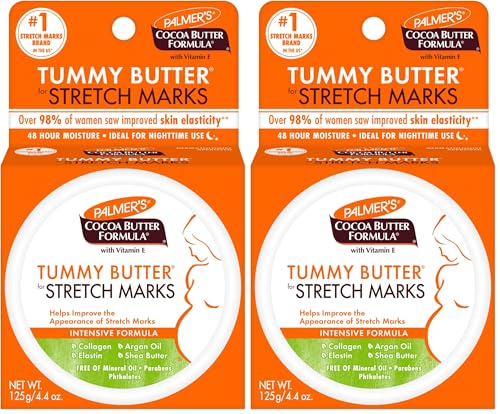 Treat your sensitive skin to the nourishing benefits of Palmer's Cocoa Butter Formula Tummy Butter. This dermatologist-approved, hypoallergenic butter contains cocoa butter, vitamin E, almond oil, shea butter, and argan oil to soothe and protect. The 4.4 oz tub provides 250mL of creamy formula to gently cleanse and moisturize your belly and other areas prone to dryness and irritation. With regular use, this butter can help reduce the appearance of cellulite. It's suitable for women with sensitive skin. This Palmer's Tummy Butter comes in a 2-pack of 8.8 oz tubs, so you can keep treating your skin to the same deep moisture it needs.