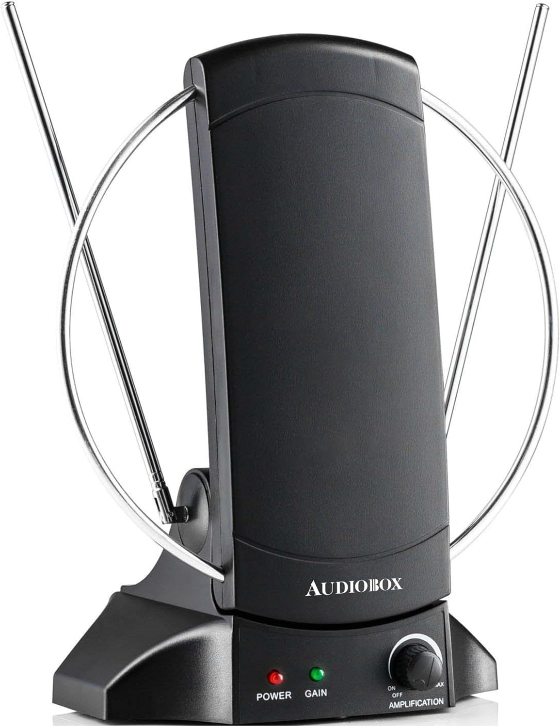 Audiobox ANT-400 Amplified Indoor Antenna with 80-Mile Range, Adjustable Gain Control, 180° Rotating Design, and UHF/VHF/FM Reception